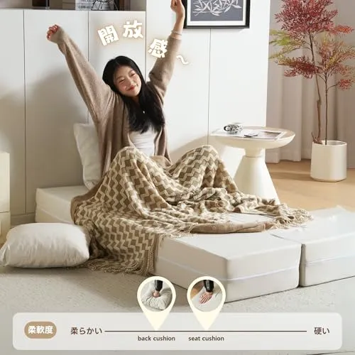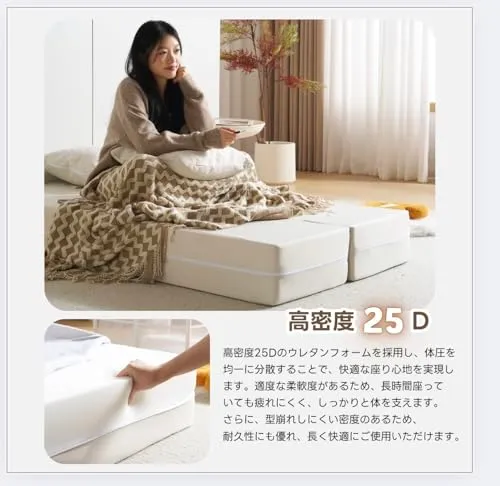 【高反発ウレタンフォーム】座面には25D高密度の高反発ウレタンを使用。ソファベットとしても十分なサポート力(120N)を備え、長時間座っても疲れにくい設計です。体の圧力を均一に分散し、二人がけソファーとしてもベッドとしても快適な座り心地を実現します。