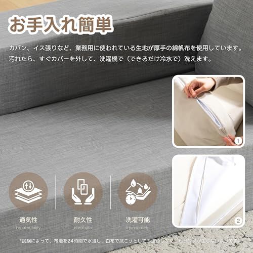 【洗濯可能なカバー】ソファーには取り外し可能な綿帆布カバーを採用。汚れたら外して洗濯機で洗えるので、常に清潔を保てます。冷水洗濯を推奨し、天気の良い日に乾燥すれば、ふたりがけソファーとして快適な座り心地を長く楽しめます。