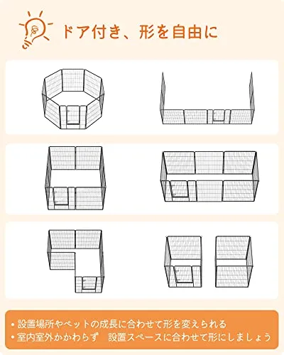 【カタチはアイデア次第】スペースに合わせて8つのパネルを活かして、長方型、正方型、八角型、L字型などに変更できます。ペットに窮屈な思いをさせる事なく、日常のトイレ訓練やハウストレーニングに便利なペットサークルです。サイズ:長方型:幅231x奥行77x高さ100cm、正方型:154x154x高さ100cm、八角型:直径200cmx高さ100cm