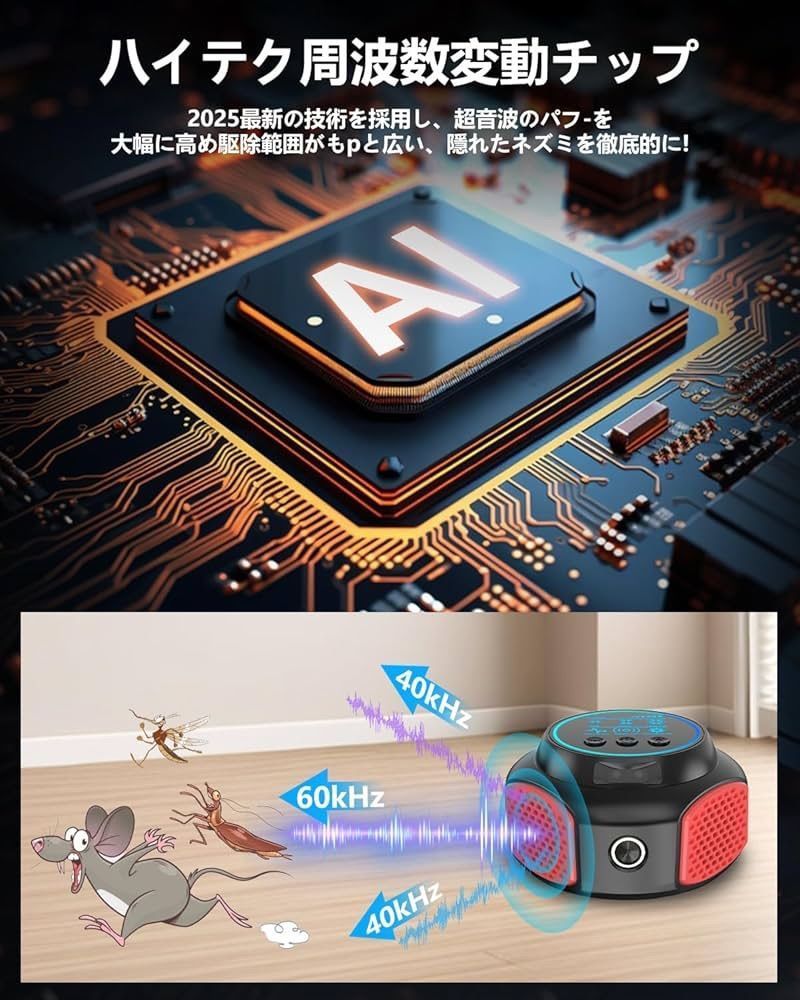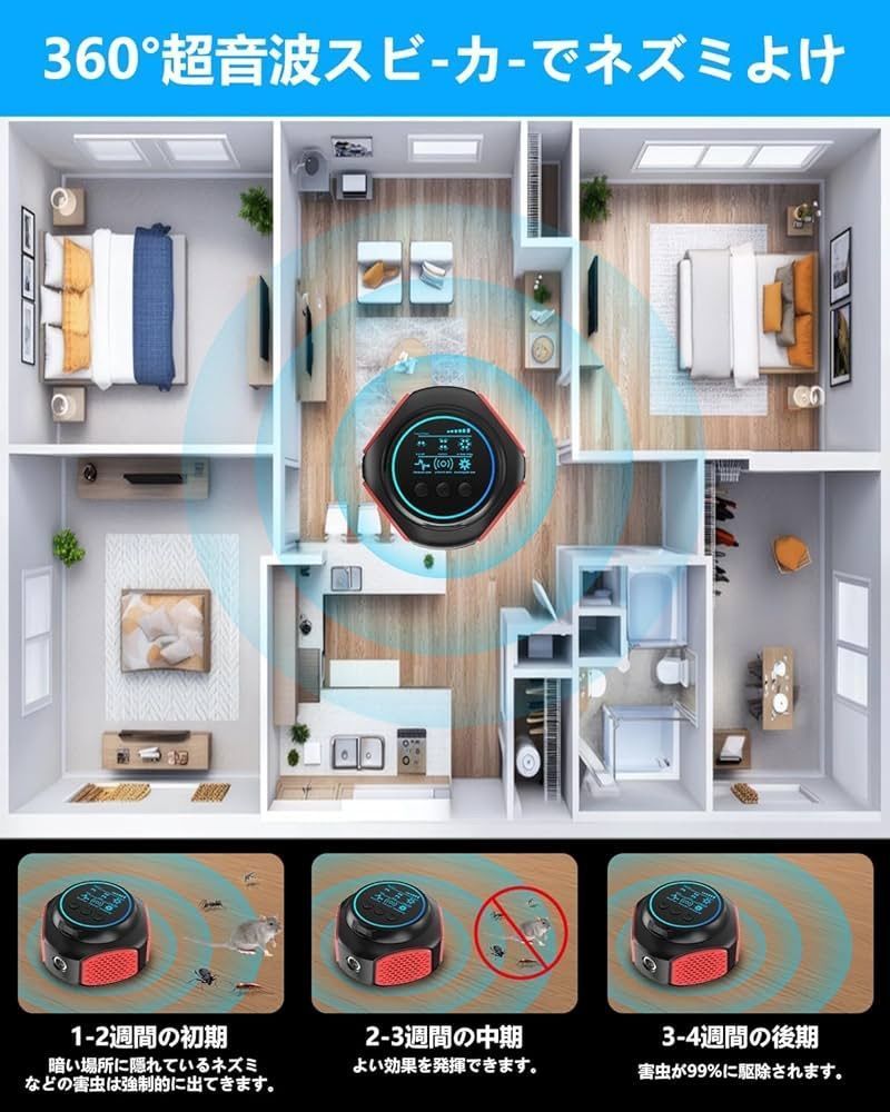 【使いやすい】こちら商品はUSB給電で、コンパクトでシンプルなデザインなので電池交換や充電は一切ありません、消費電力も少ないので、長時間使用しても電気代の心配がありません。また、様々なモードや調節機能があり、シーンやマウスの状態に応じて柔軟に設定できます。せめて2-4週間をご使用ください。1-2週ぐらい、害虫の嗅覚神経が刺激され、周りに走り回る。2-3週後、良い効果が発揮できます。