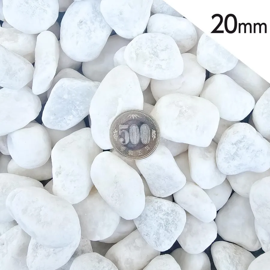 【天然素材ならではの魅力】 サイズや形状に自然のバラツキがあります。 また白玉石が濡れると、ツヤが出ます。 材質:砂利 (自然石) ※薬剤不使用 サイズ:20mm-30mm 色:白、グレー、ベージュ 重量:20kg/約17.8L