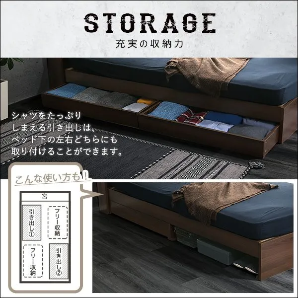 衣類や寝具などをたっぷり収納できる引き出しは、ベッドの左右に取付可能!