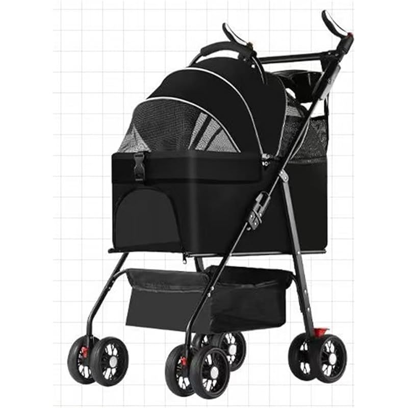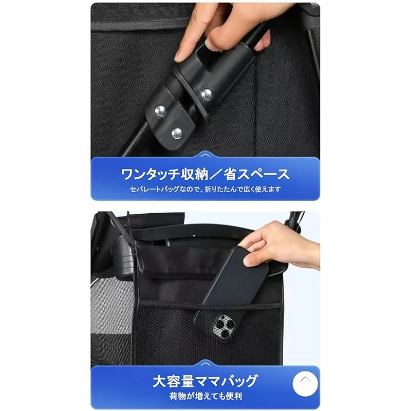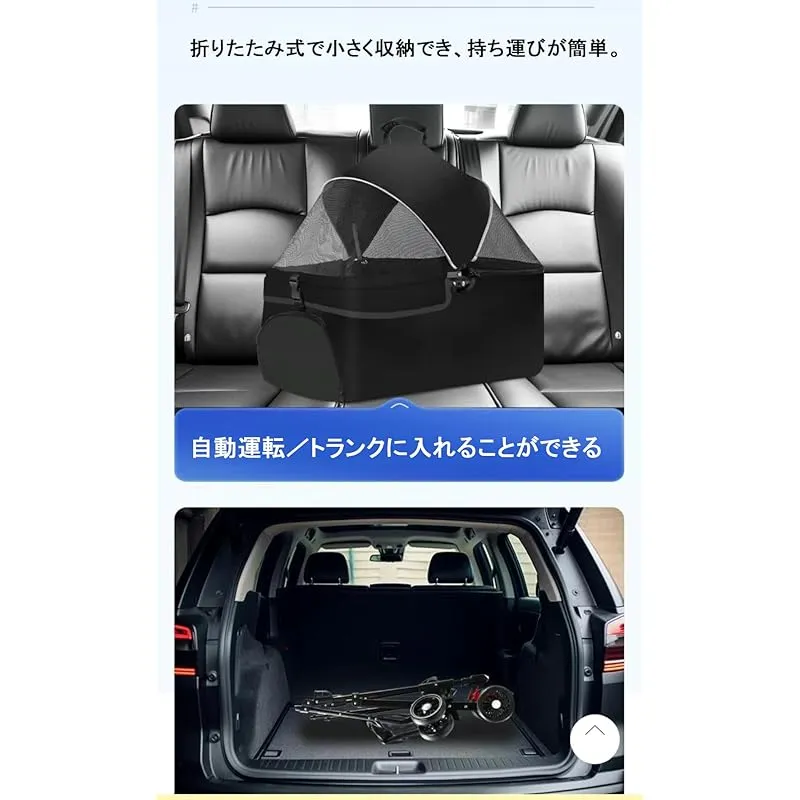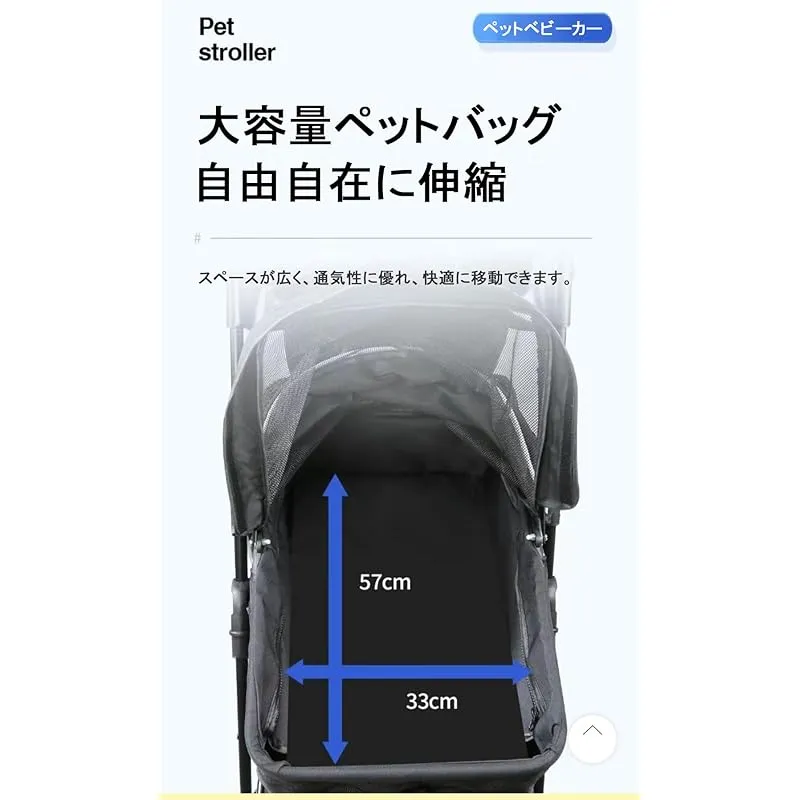 【簡単に使える】ペットとの旅行に欠かせないペット用ベビーカー:フレームは片手で折りたたむことができ、自立するのでコンパクトに収納できる。バスケットには大きなポケットが1つ、フレームにはカップホルダーと底部に大きな収納スペースがあります。散歩や買い物に必要なペット用品の収納スペースも十分。通常、小型犬1~2匹または中型犬1匹を収容でき、を搭載している 安全フック、ペットが脱走する心配もありません。
