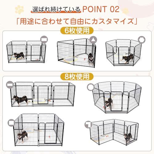 【自由な組み合わせ】パネルの枚数により、フェンスを長方形、正方形、八角形、L字型など、さまざまな形に組み合わせることができます。お家のスペースやペットの状況に合わせて自由に設置できます。8枚セットは2つのフェンスに分けて、2匹のペットを分けることも可能です。