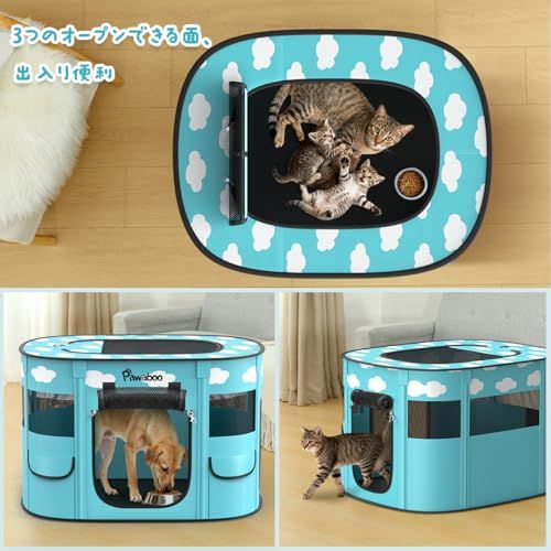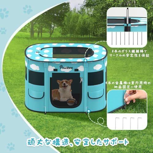 「幅広い使用場面」 ペットの遊びサークルとしてはもちろん、ペットの分娩室、ベビーサークルとしても適用します。屋根付きのデザインで、おもちゃなどの収納サークルとしての活躍も期待できます!4本の固定用鉄棒を付属して、公園などで使うときに、土に差し込んで固定して、やんちゃなペットでも安心に使用できます。付属の折り畳みボウルを持って、ペットを連れてピクニックでも行きましょう!