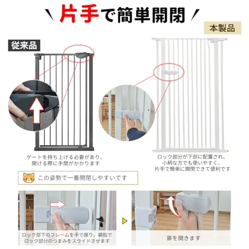 【猫用の安心ゲート】室内飼いの猫ちゃんの脱走防止対策として最適なペットゲートです。キッチンや階段、玄関など、立ち入りを制限したい場所に設置することで、猫の思わぬ事故や脱走を防ぎ、ご自宅の安心な環境づくりをサポートします。