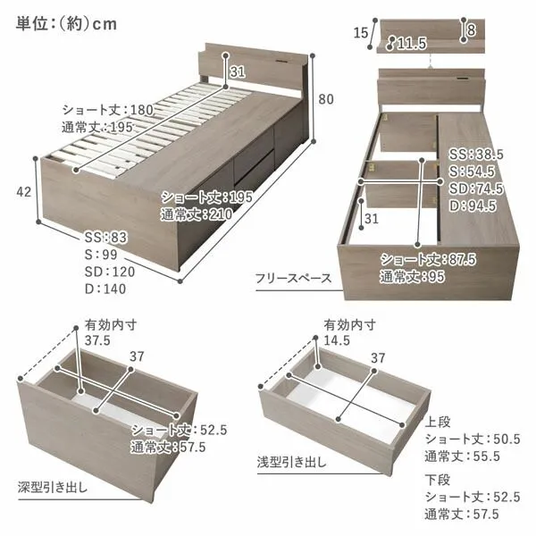 ■耐荷重(約) ショート丈セミシングル/ショート丈シングル/通常丈シングル本体:120kg 通常丈セミダブル本体:180kg 通常丈ダブル本体:200kg 引き出し:各15kg