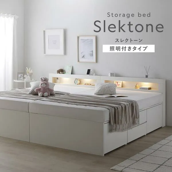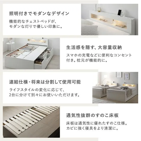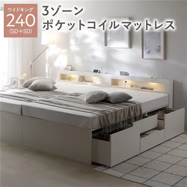 照明 宮付き チェスト ベッド 通常丈ワイドキング240 SD+SD ホワイト 3ゾーンポケットコイルマットレス付 連結 チェストベッド 収納ベッド すのこベッド ベッドフレーム 寝具 宮棚付き 棚付き ヘッドボード 大容量 引き出し 4杯 大量収納 収納付き