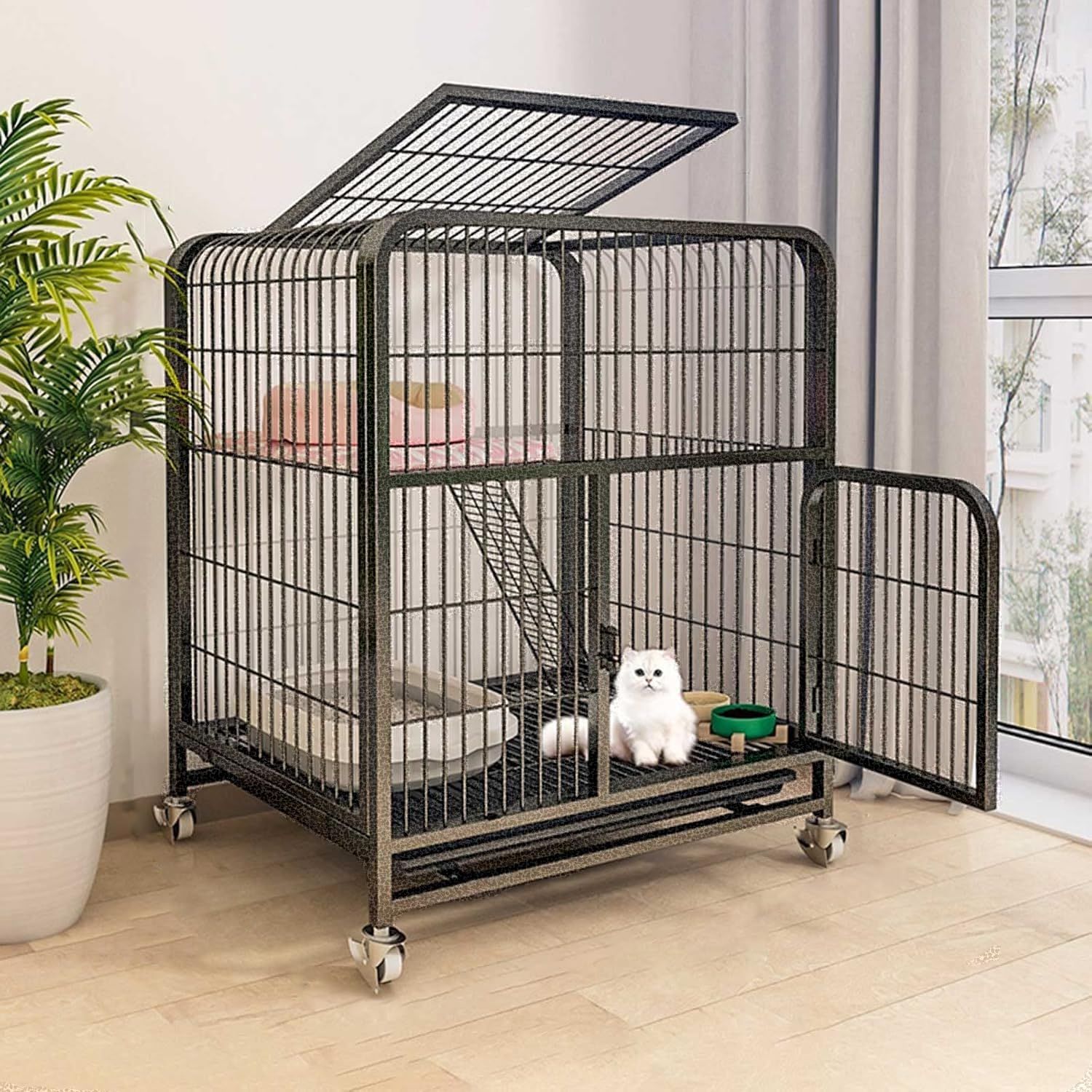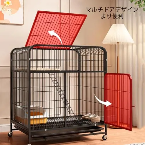 【出入り便利】異なる体型の猫にも同時に使用できます。猫が休息や遊びをする場所になります。ケージのスペースを分割し、複数の猫や他のペットが使用できます。スペースを有効に活用し、猫の幸福感を効果的に高めます。ドアの開閉位置に応じて猫が自由に出入りできます。キャットケージにはドアと天窓が付いており、砂の掃除がしやすい特大のサイドドアと、猫とのふれあいがしやすく、キャットハンモックを簡単に吊るせる天窓が上部に付いています。このミニキャットケージは、ちょうど良い大きさで、あらゆる種類の猫に最適です。