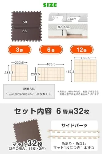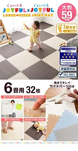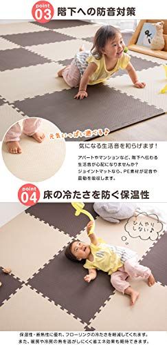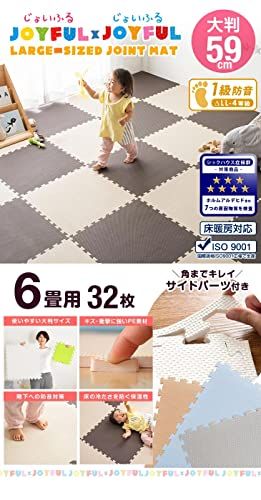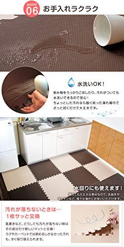 【お手入れ方法】・生産上マットをカットする際に生じた粉末が付着している場合がございます。 一度綺麗に水拭きしてからご使用ください。色落ちではありませんので、ご安心ください。 ・汚れた場合は固く絞った雑巾で拭き取るか、水洗いをしてください。 ・水分が隙間に入り込んだ場合はカビ発生の原因となる場合がありますので、定期的にマットを剥がして掃除してください。 ・匂いが気になる場合は、風通しの良いところで陰干してください。 "・表面の凹凸の深さに若干の個体差がある場合がございます。 ・ロットによって色味が異なる場合がございます。 ・床暖房の種類等によって、商品に多少の反りが生じる場合がございます。 ・PE素材の特性上、使用するうちに負荷がかかる部分に多少のへたりが生じます。 そのため、既に使用しているマットに新しいマットを繋げて使用する際、上手く繋がらない場合もございますので、予めご了承ください。 2019年1月10日に素材をEVAからPEに変更しました ※床材(塩化ビニル・フローリング等)によって、色移りや変色が起こる場合がございます。床とマットの間に敷物や防護シートを敷いていただくことを推奨しております。"