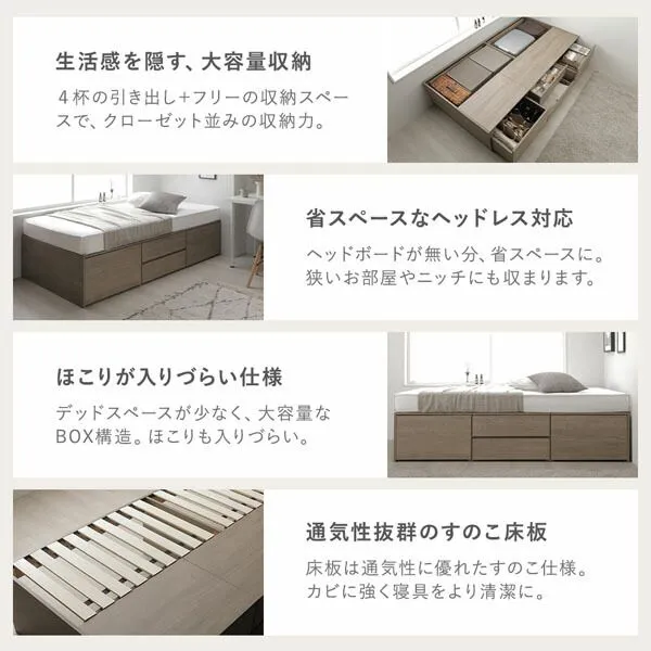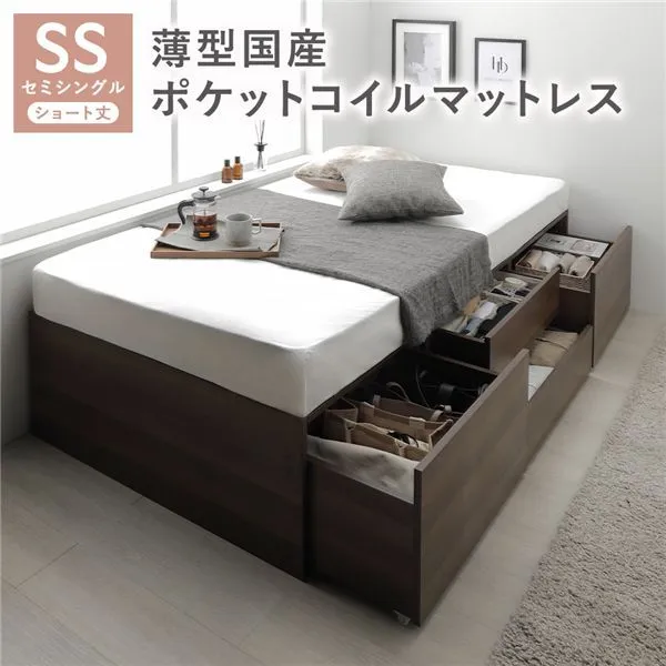 ヘッドレス チェスト ベッド ショート丈セミシングル ブラウン 薄型国産ポケットコイルマットレス付 大容量 引き出し 収納スペース 通気性 すのこ 収納ベッド 収納付きベッド チェストベッド ベッドフレーム ヘッドレスベッド 寝具 ベット 寝室家具 ベッドルー