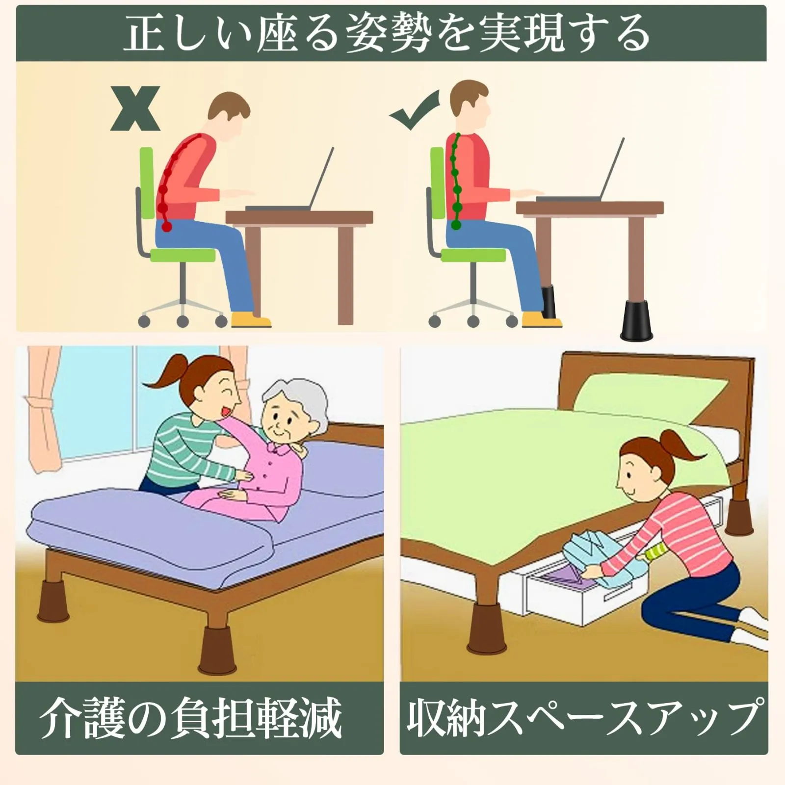 【使用効果】家具の脚を簡単に高くすることではなく、スペースをプラスし、掃除もらくになり、高齢者にとって助けナシでベッドから出れます。収納力アップももちろんアップします。