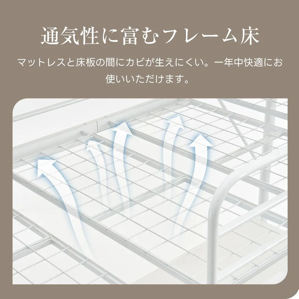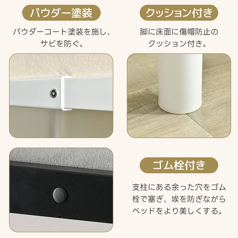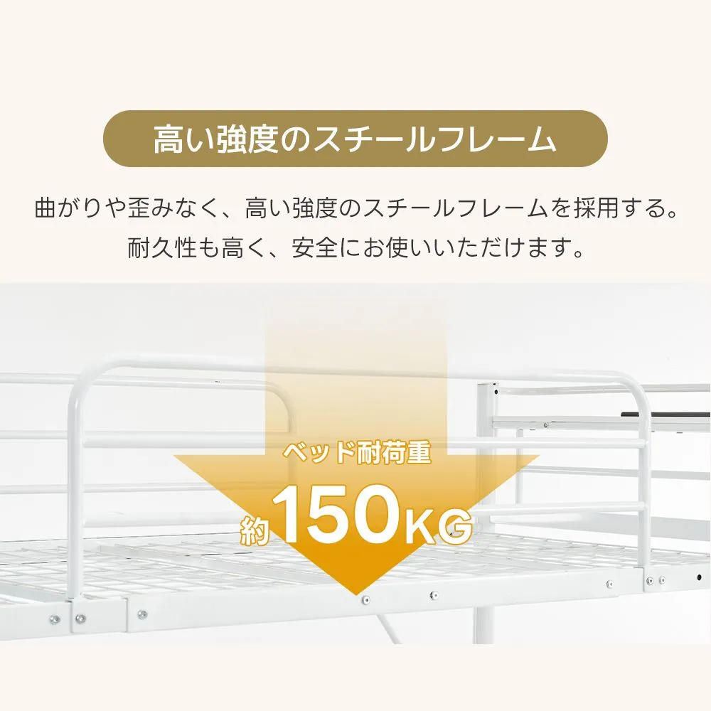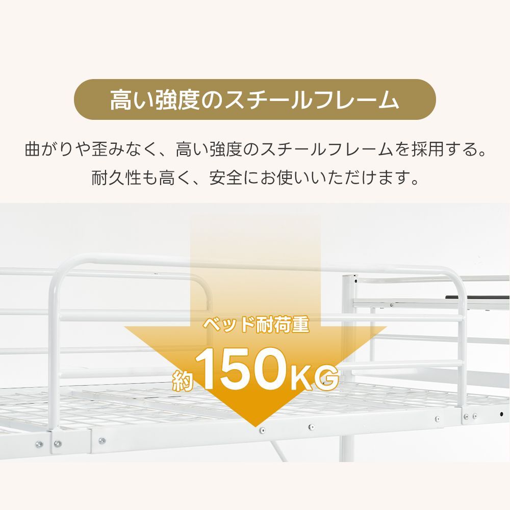 【高い強度のスチールフレーム】ベッド耐荷重約150kg曲がりや歪みなく、高い強度のスチールフレームを採用する。耐久性も高く、安全にお使いいただけます。