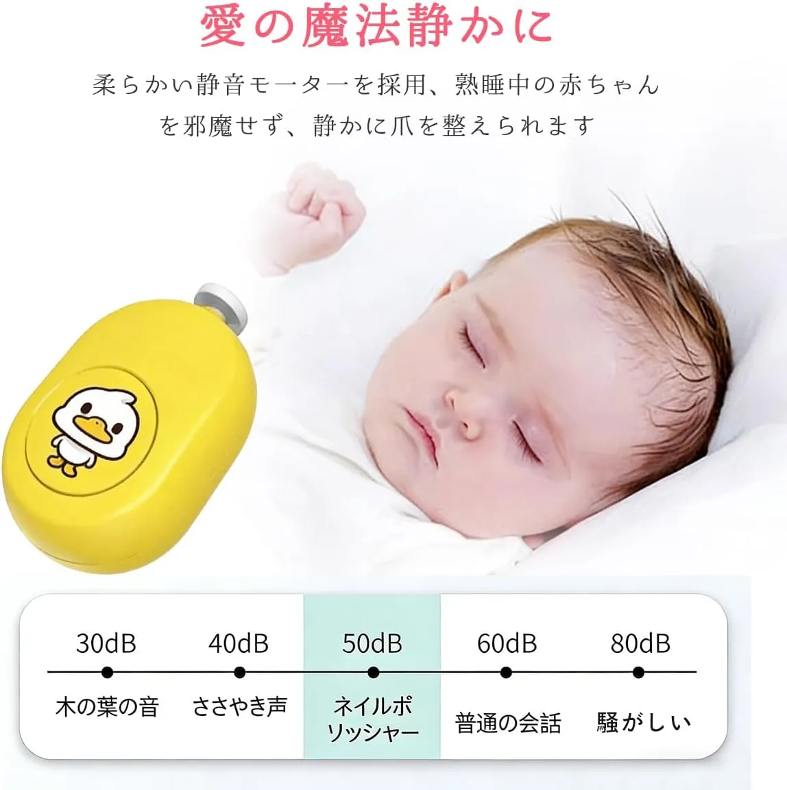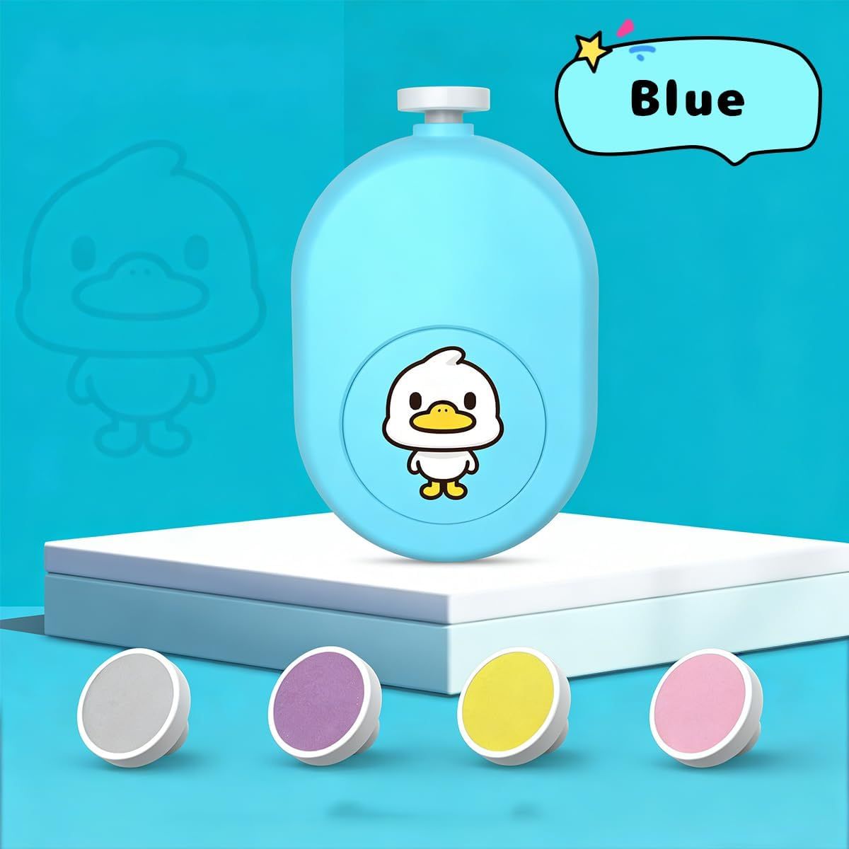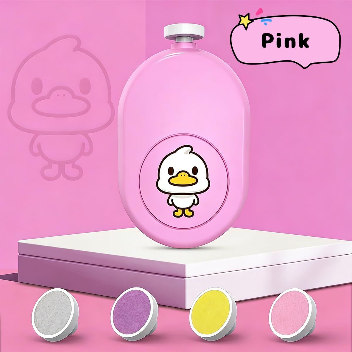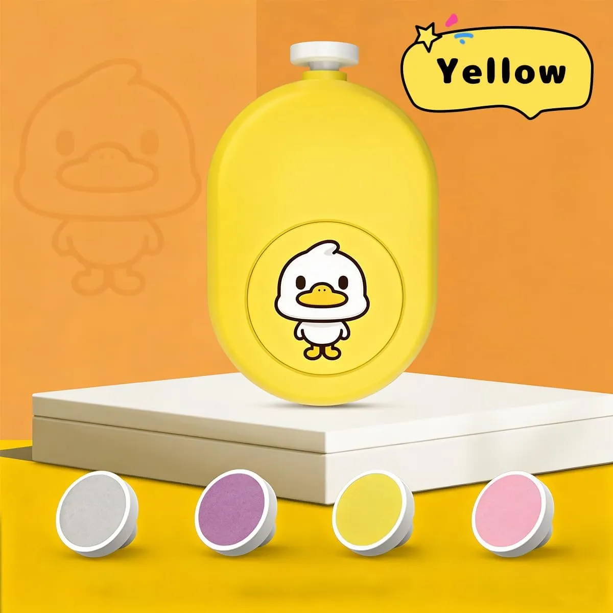 可愛らしいアヒルデザインの電動爪やすりは、赤ちゃんから大人まで使える便利なネイルケアツールです。