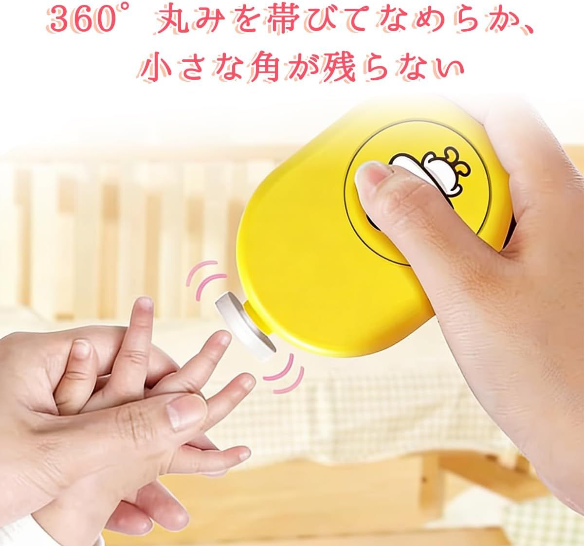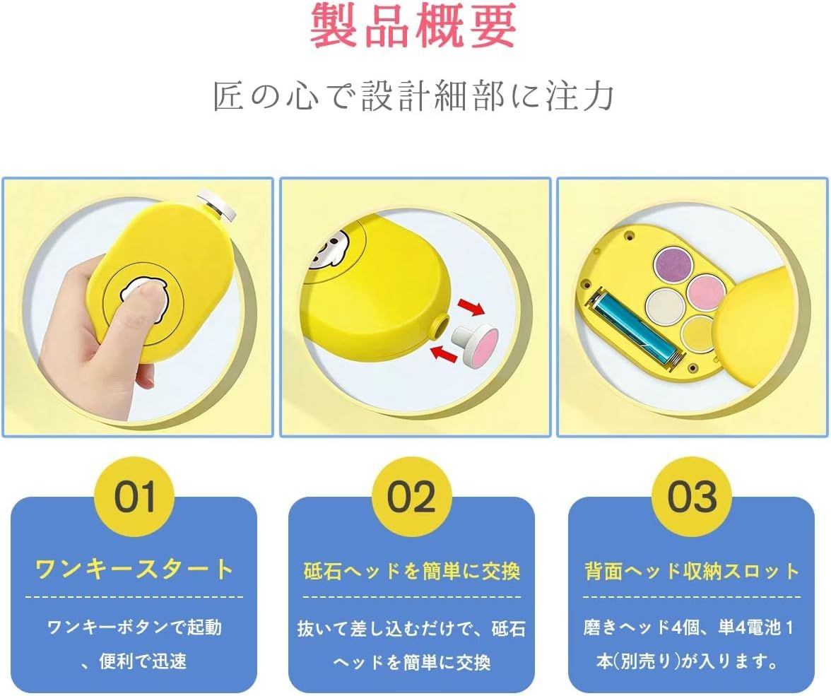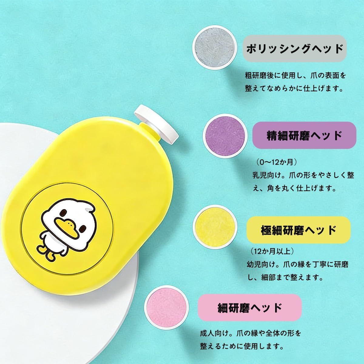 【 商品仕様詳細】 ・4種類の研磨ヘッド付き: ポリッシング、精細研磨(0~12ヶ月)、極細研磨(12ヶ月以上)、細研磨(成人向け)の4つのヘッドで、赤ちゃんから大人まで年齢に応じた爪のケアが可能です。 ・ワンキー起動設計: ボタンを押すだけで簡単に起動できる便利な電動爪やすりで、赤ちゃんの爪を安全かつスピーディーにお手入れできます。 ・簡単ヘッド交換システム: 研磨ヘッドは抜いて差し込むだけで簡単に交換可能。本体背面には予備の研磨ヘッドを4個収納できるスロット付きで便利です。 ・かわいいアヒルデザイン: 可愛らしいアヒルのイラストが描かれた、イエロー、ピンク、ブルーの3色展開で、ベビー用品としても最適なデザインです。 ・安全な電動ネイルケア: 赤ちゃんの柔らかい爪を傷つけにくい電動爪削りで、従来の爪切りよりも安心してご使用いただけます。
