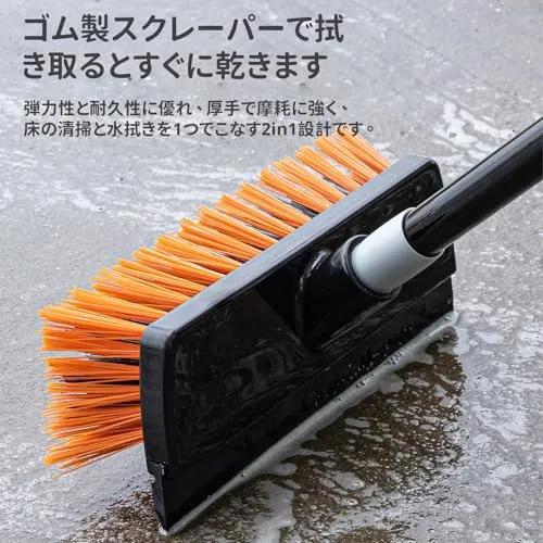 【便利な水切りワイパー付きのデッキブラシ】ヘッド部に水切りワイパー付き、1本でブラッシングと水切りができます。玄関、ベランダ、厨房、お風呂場など室内の掃除もしくは外回りのタイルやコンクリ床のお掃除はこれ1本!