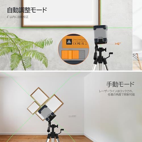 【自動水平&手動モード】振り子のロックを解除すると、レーザーレベルは4以内に自動水平になります(そうでない場合はレーザーが点滅し続けます)。振り子をロックして手動モードに切り替え、異なる角度からのアライメントニーズに対応します。