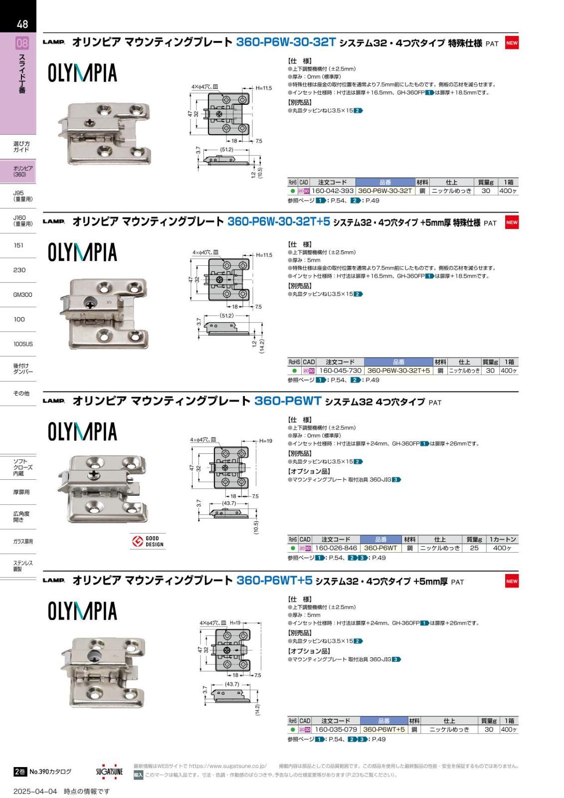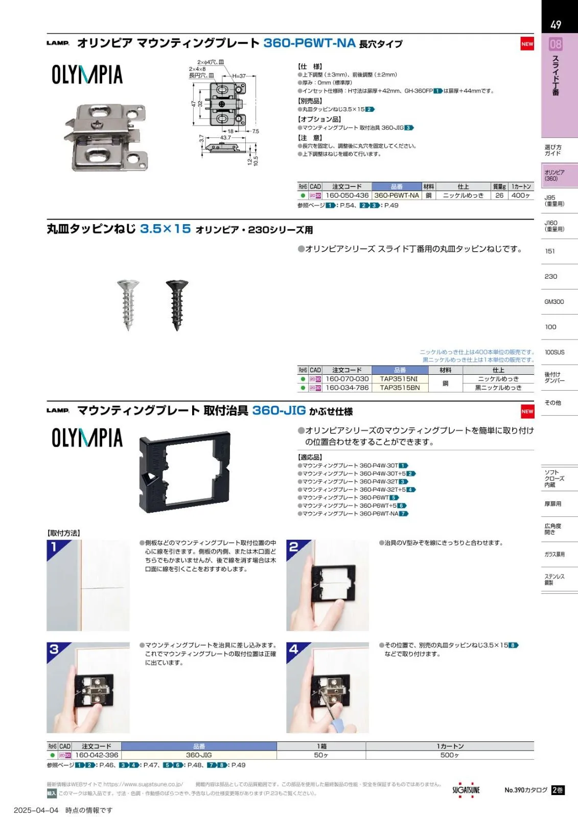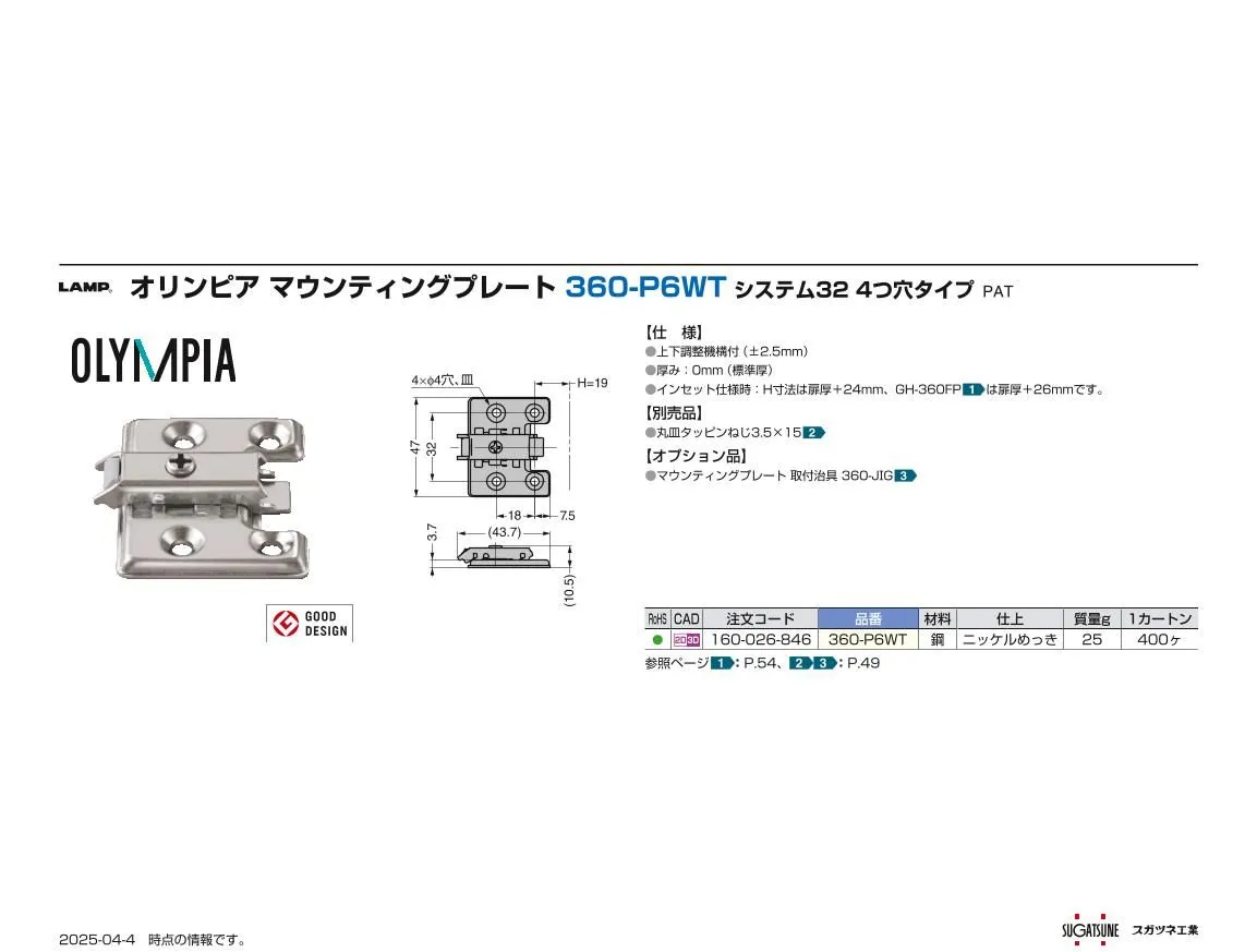 スガツネ工業スライド丁番用 マウンティングプレート 360-P6WT