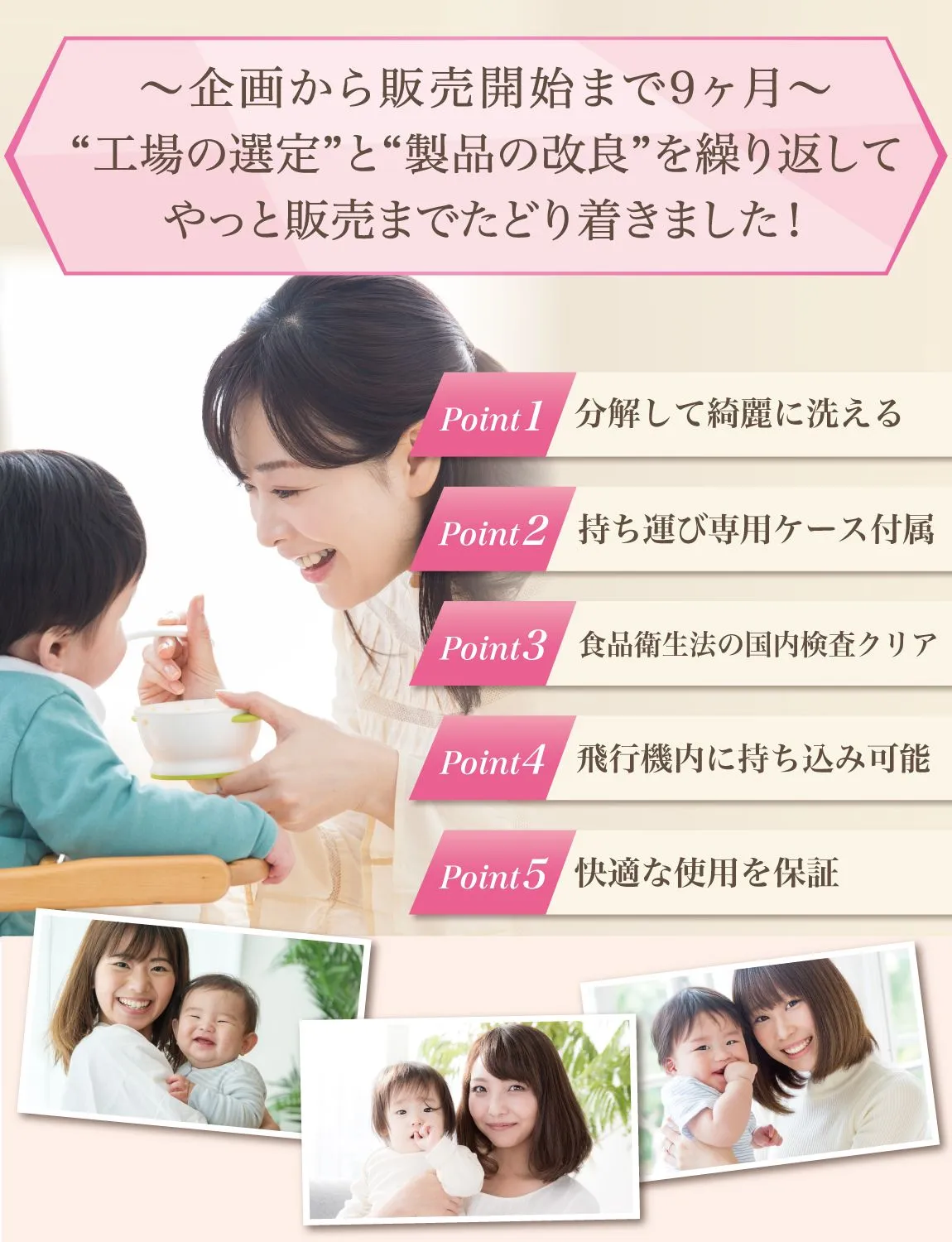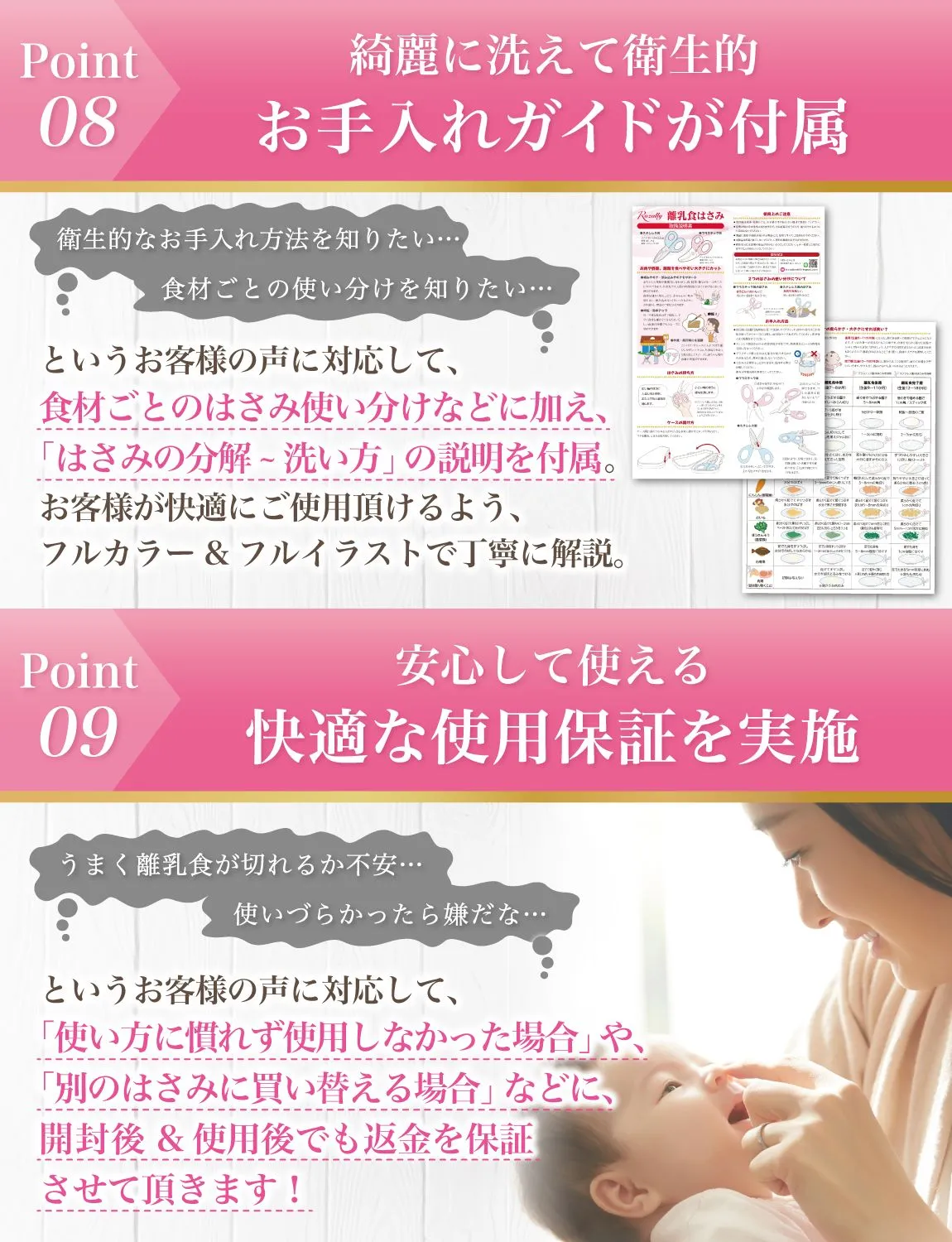 【フルカラー説明書が付属!】 本製品には初めて使う方でも最大限に本製品を活用できるよう、 フルイラスト62枚で解説した説明書を付属させて頂きました。 「衛生的に使用するお手入れ方法」に始まり、 「月齢ごとの食材カット方法」などコラムを交えて、 最大限に活用できるよう解説しています。