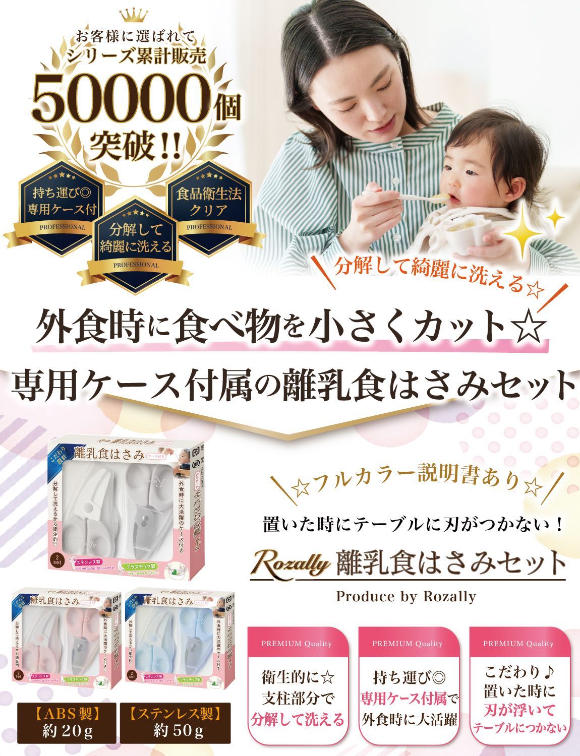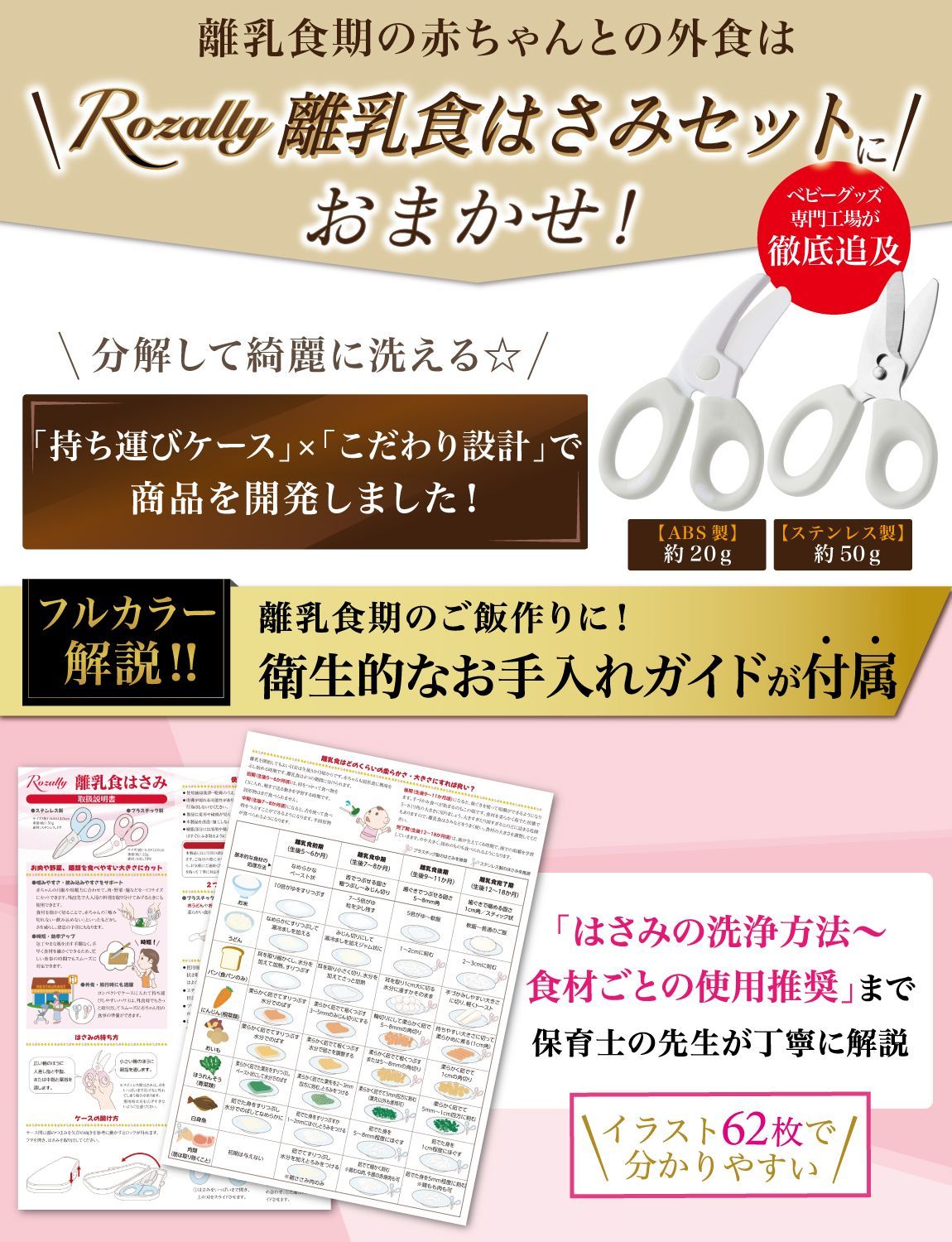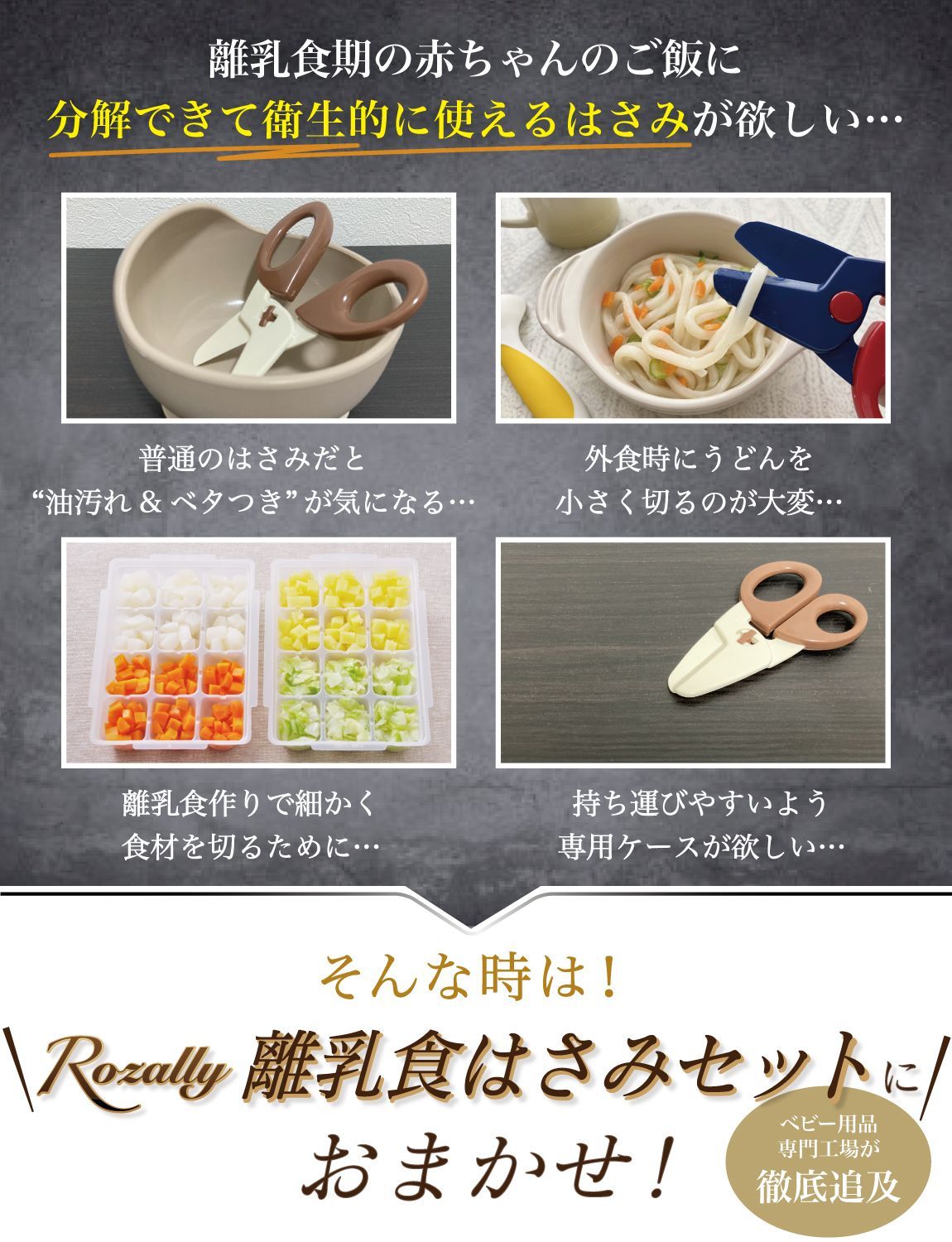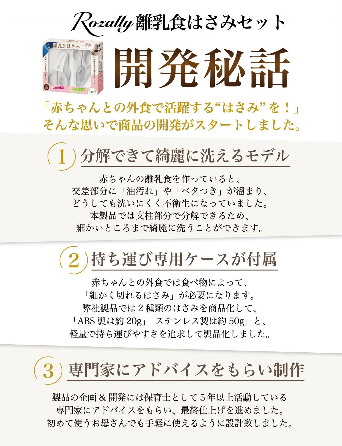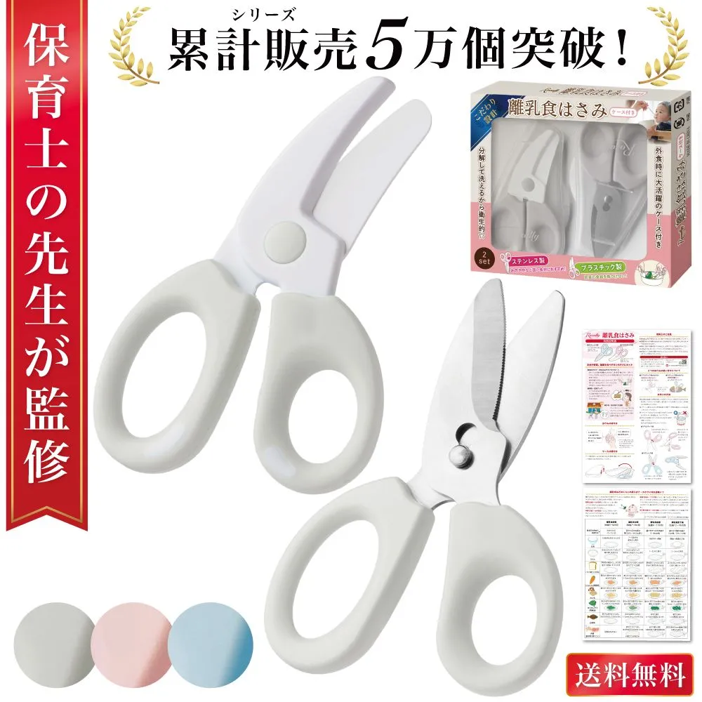 【こだわり】 様々なメーカーから赤ちゃんのご飯をカットするグッズとして ” 離乳食用はさみ ”や” 離乳食用フードカッター ”など 日本製/中国製など様々に販売されていますが、 Rozallyの 離乳食はさみ は”こだわり”が一味違います。 「プラ製/ステンレス製のセット」で月齢や食材に合わせて使い分けができ、 「それぞれ専用ケース付」で持ち運び時に大活躍致します。