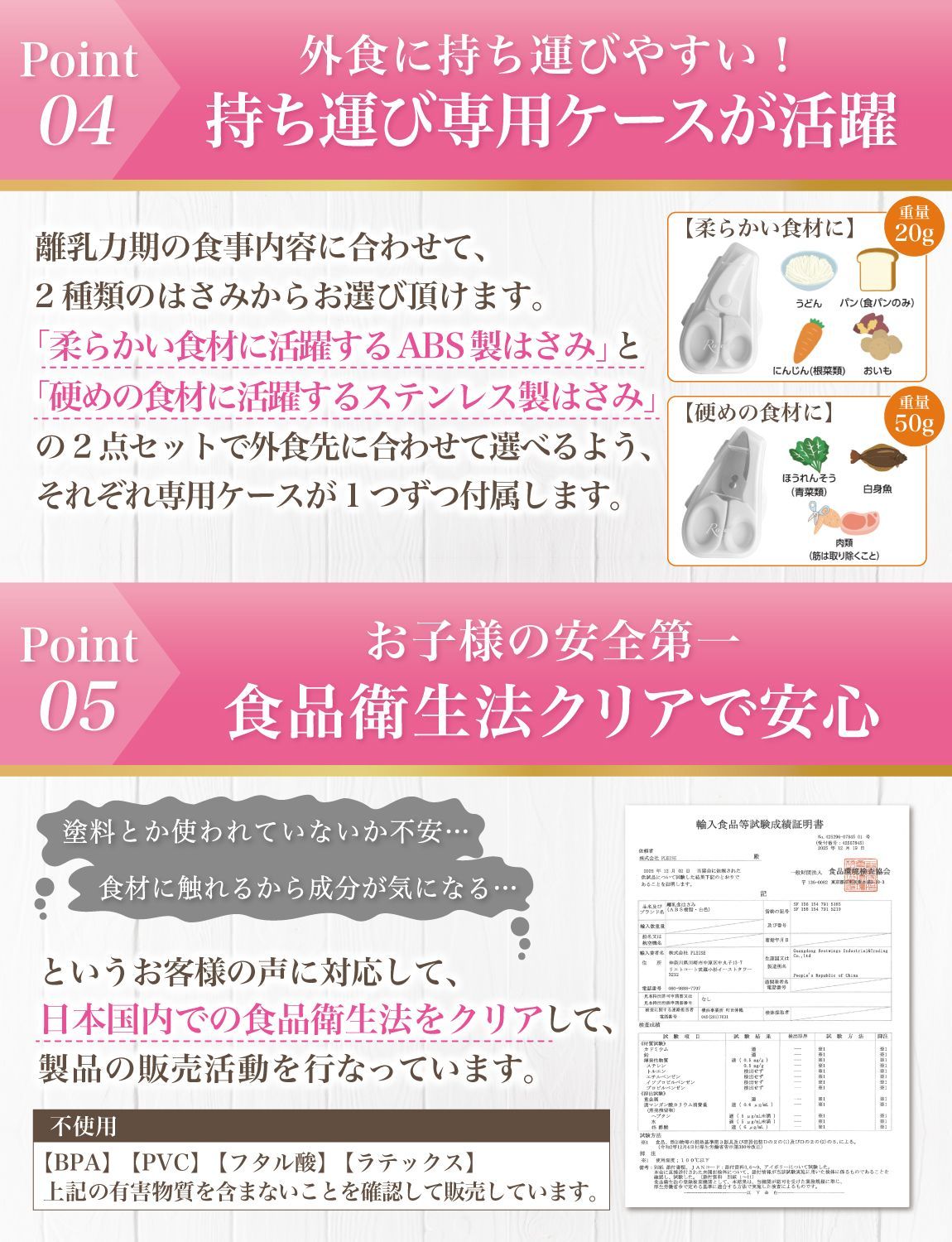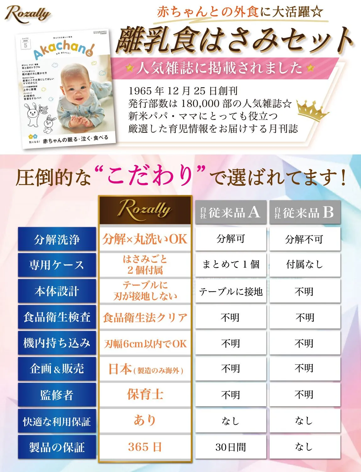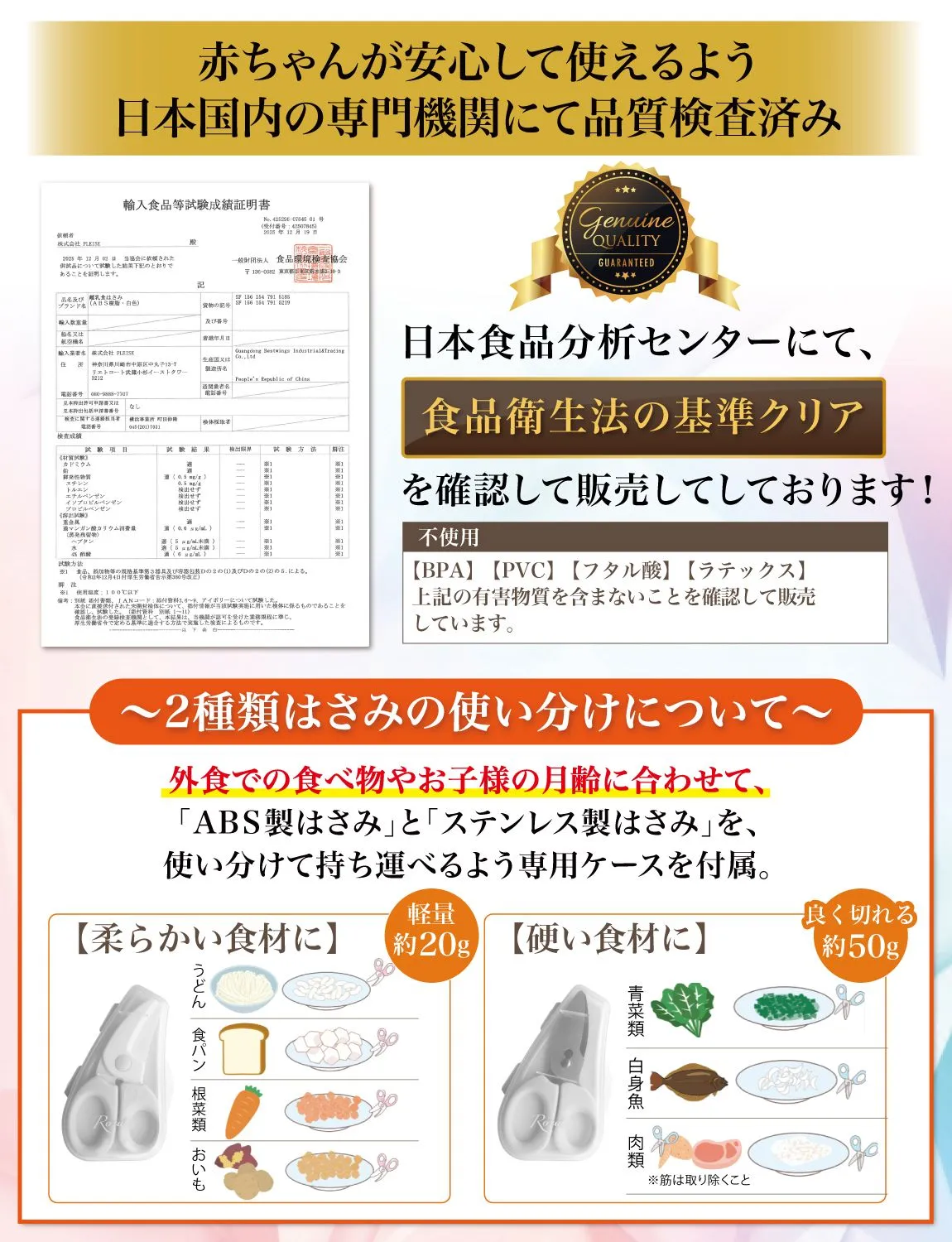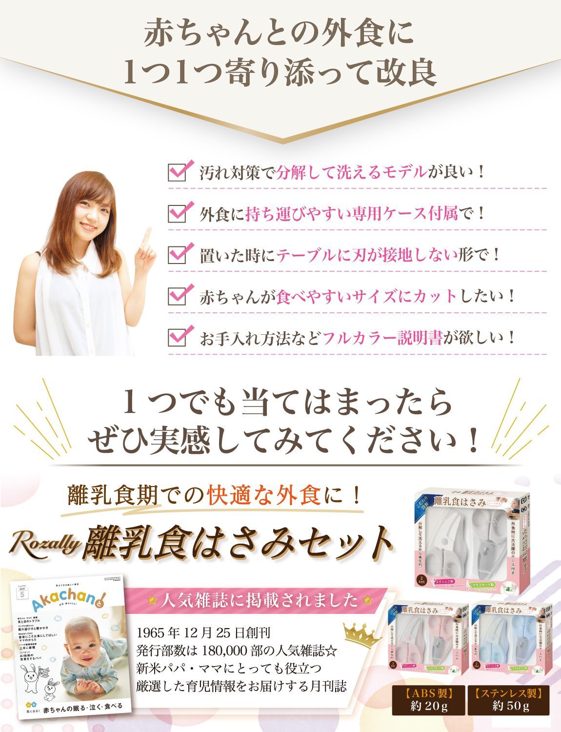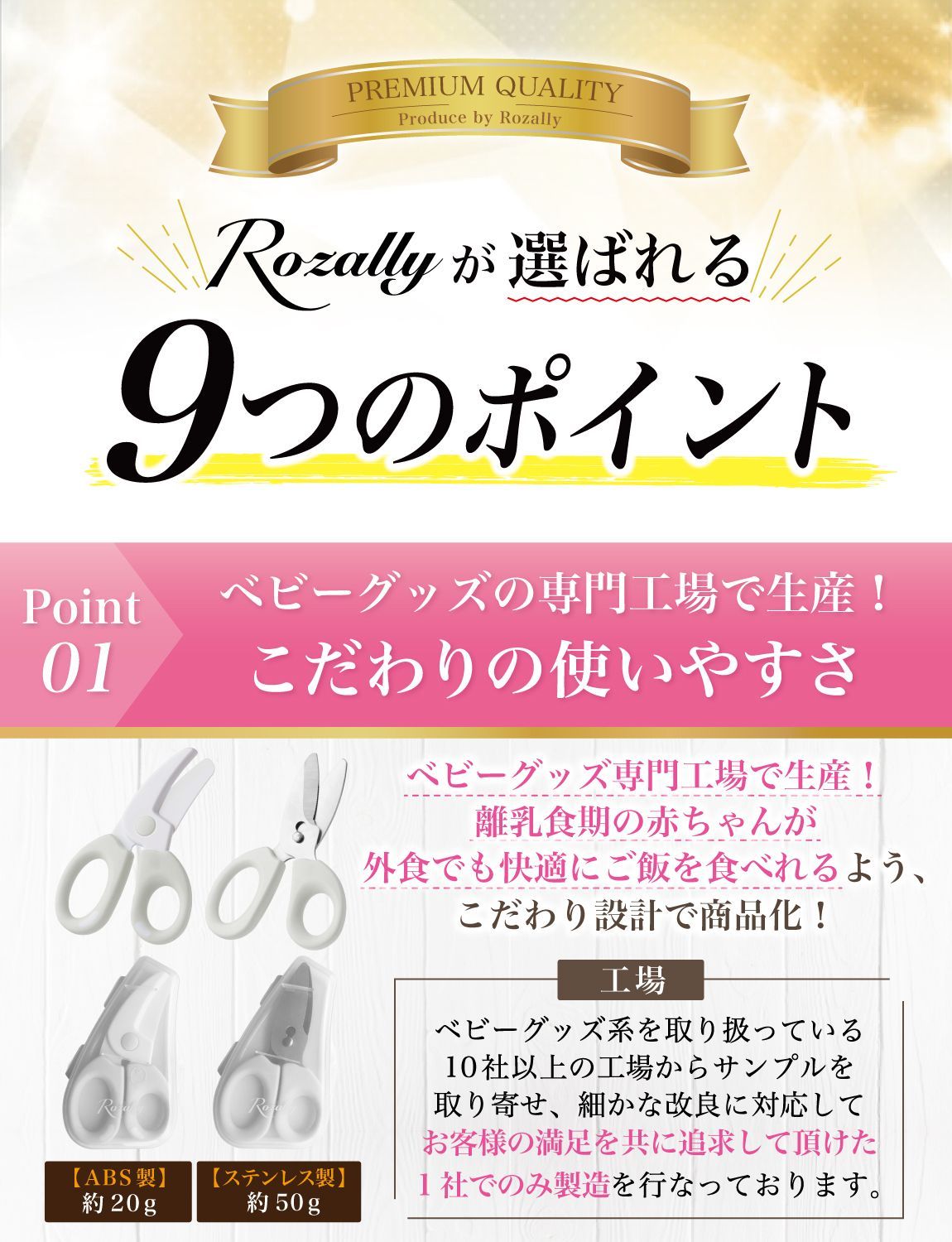 【こだわり】 様々なメーカーから赤ちゃんのご飯をカットするグッズとして ” 離乳食用はさみ ”や” 離乳食用フードカッター ”など 日本製/中国製など様々に販売されていますが、 Rozallyの 離乳食はさみ は”こだわり”が一味違います。 「プラ製/ステンレス製のセット」で月齢や食材に合わせて使い分けができ、 「それぞれ専用ケース付」で持ち運び時に大活躍致します。