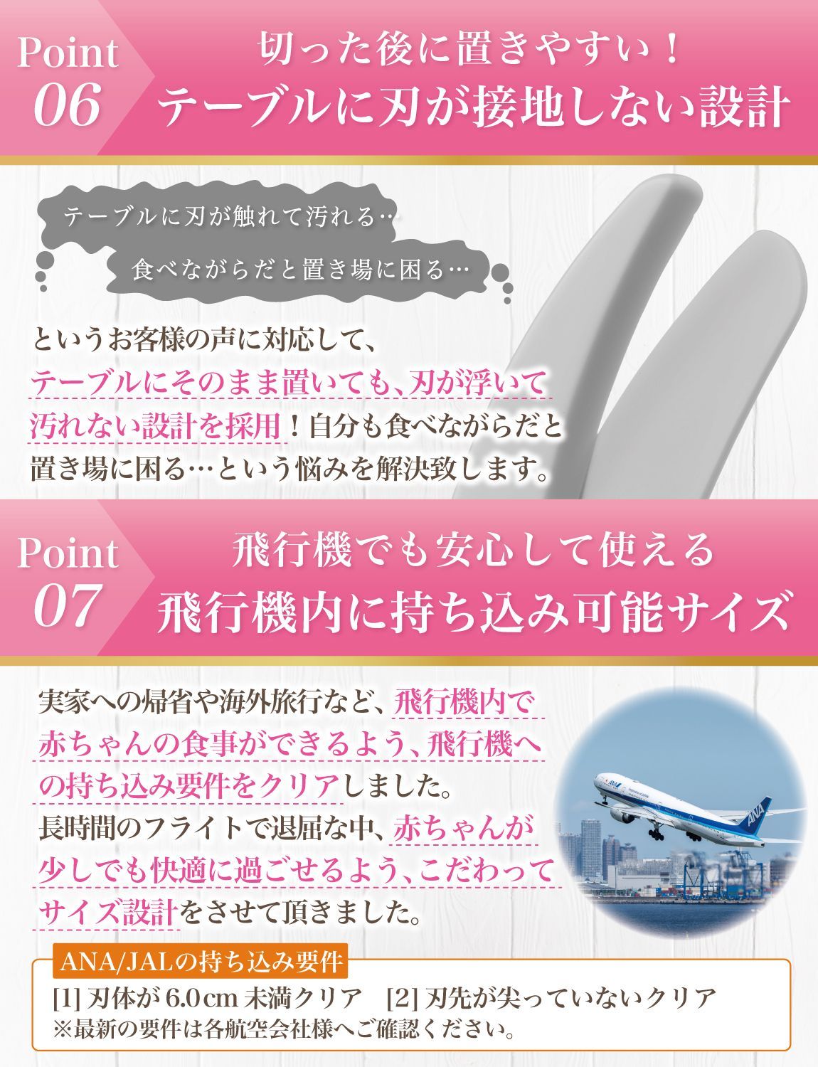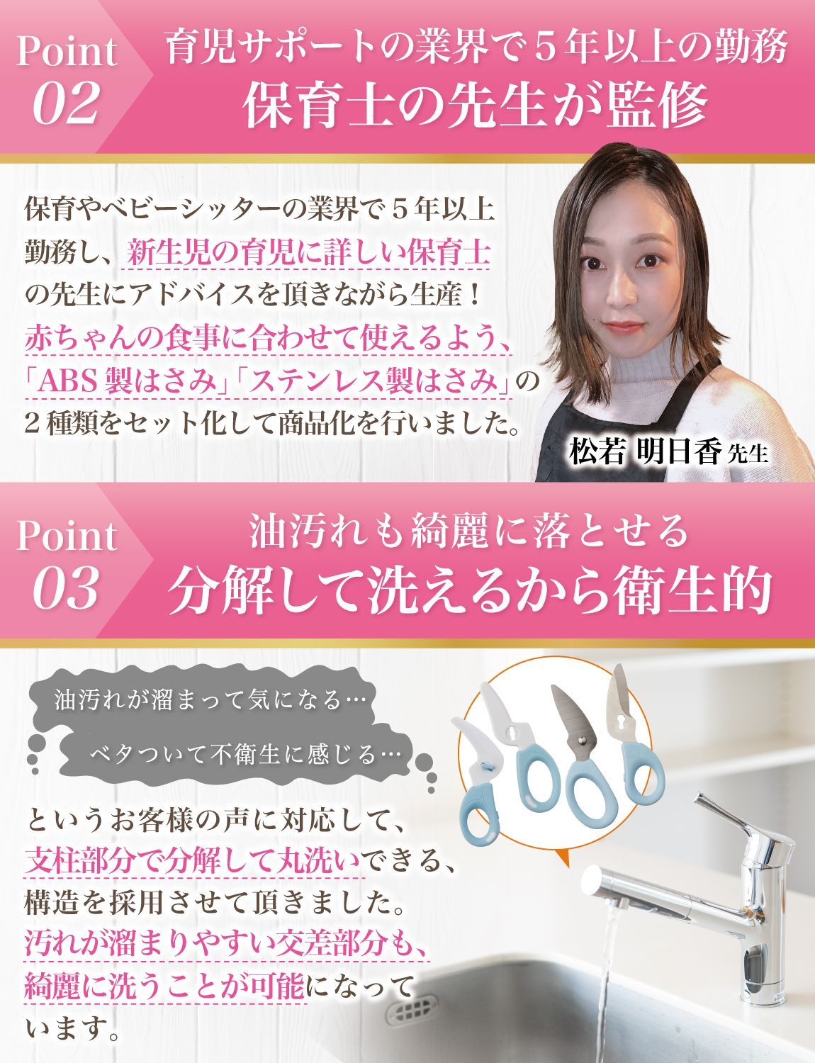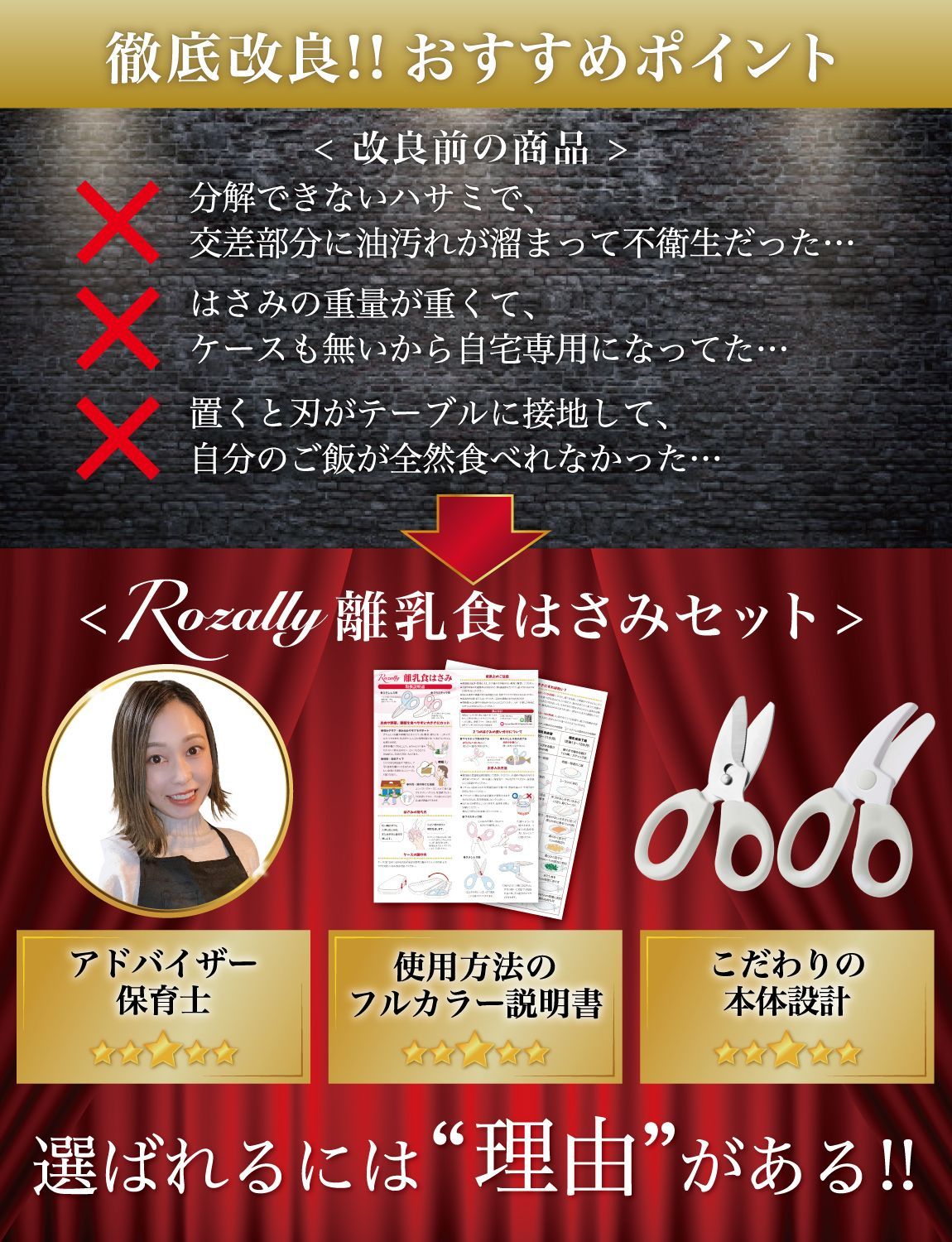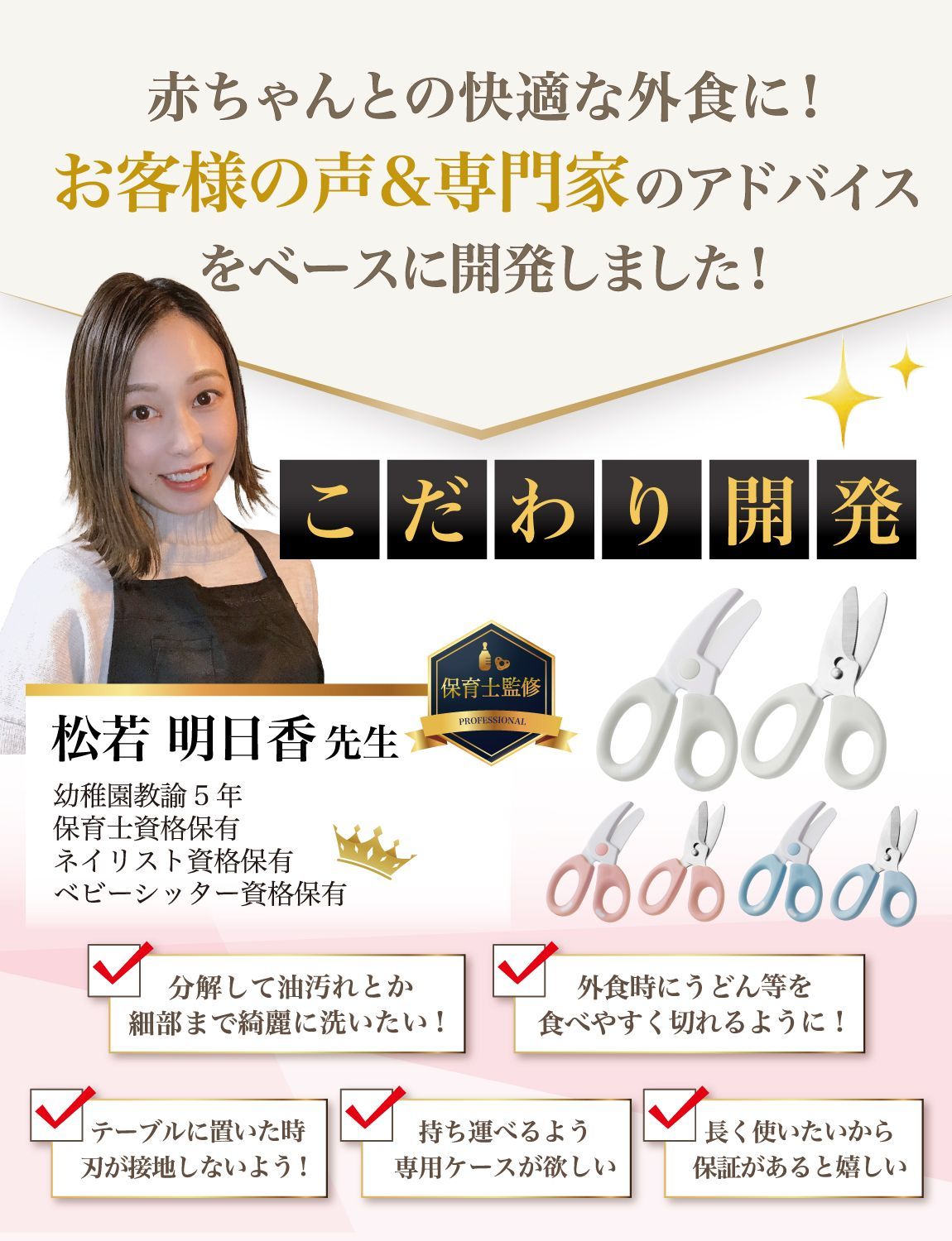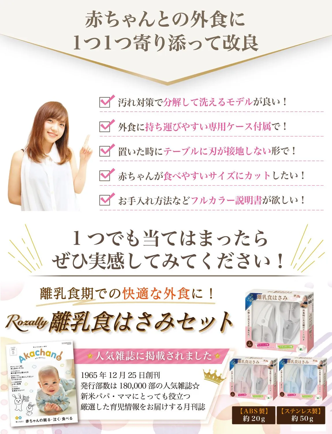 【こだわり】 様々なメーカーから赤ちゃんのご飯をカットするグッズとして ” 離乳食用はさみ ”や” 離乳食用フードカッター ”など 日本製/中国製など様々に販売されていますが、 Rozallyの 離乳食はさみ は”こだわり”が一味違います。 「プラ製/ステンレス製のセット」で月齢や食材に合わせて使い分けができ、 「それぞれ専用ケース付」で持ち運び時に大活躍致します。