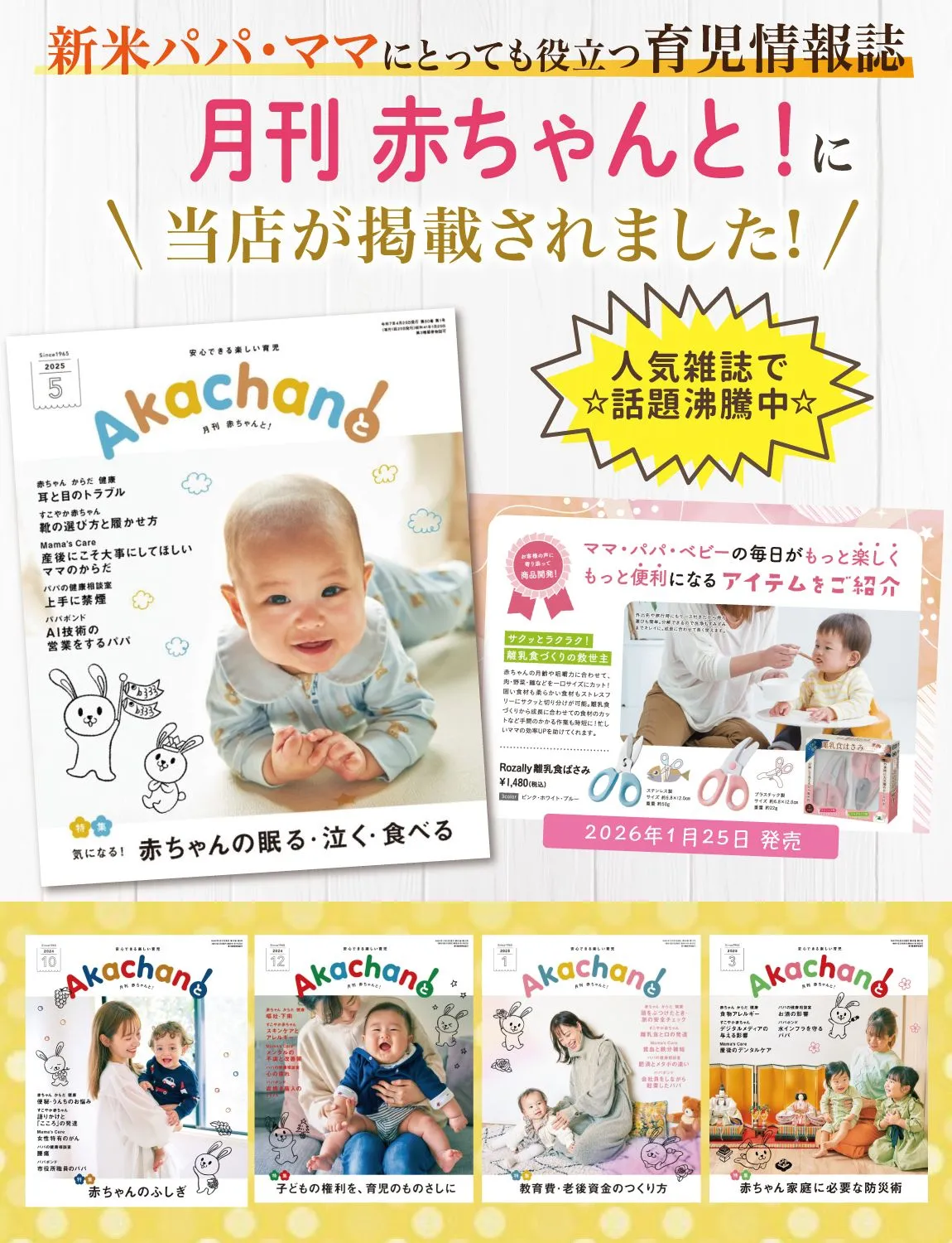 【赤ちゃんとの外食に】 Rozally 離乳食はさみ ( 離乳食フードカッター ) がついに正式販売開始。 「赤ちゃんとの外食に食べ物を細かくカットできるハサミが欲しい」 「食材に触れるから分解できて洗える離乳食はさみが欲しい」 というお客様に人気な プラスチック製 + ステンレス製 の離乳食はさみを、 それぞれケース付属で商品化致しました。 「持ち運びやすいケース付のハサミが良い…」 「分解して洗えるモデルで食洗機対応だと嬉しい…」 そんなお客様の声から生まれた食べ物を細かくカットする事に活躍する ベビー用フードカッター です。