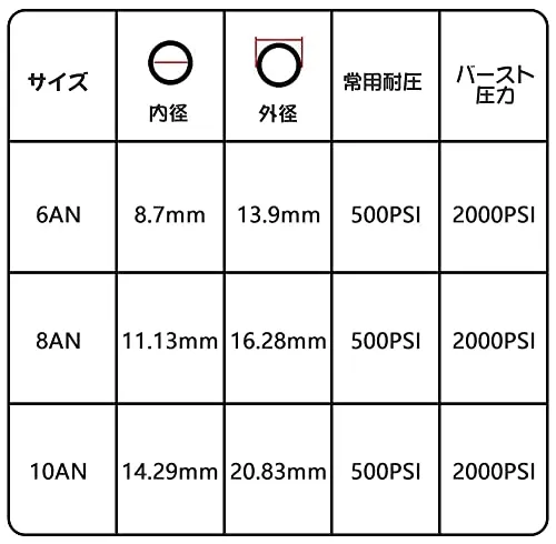 【商品仕様】:サイズ:AN6 長さ:3M 内径:8.7MM 外径:13.9MM 使用温度範囲:-40-148.9