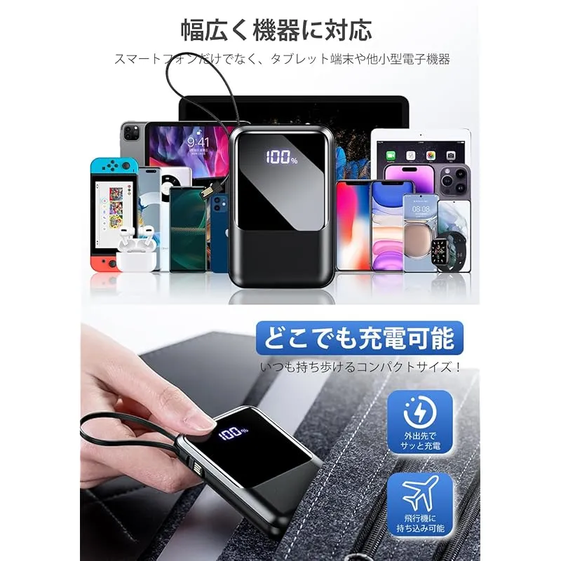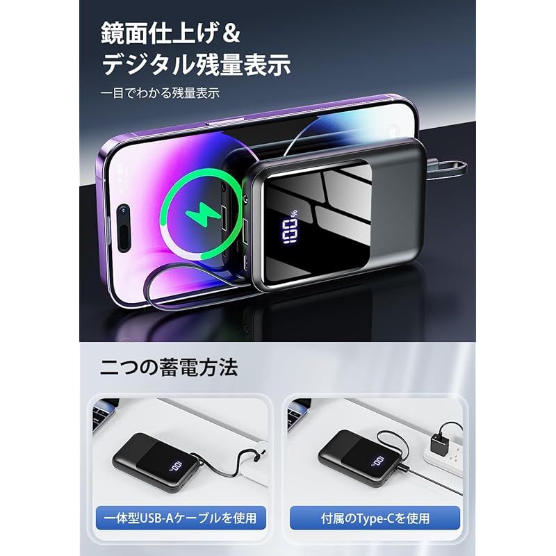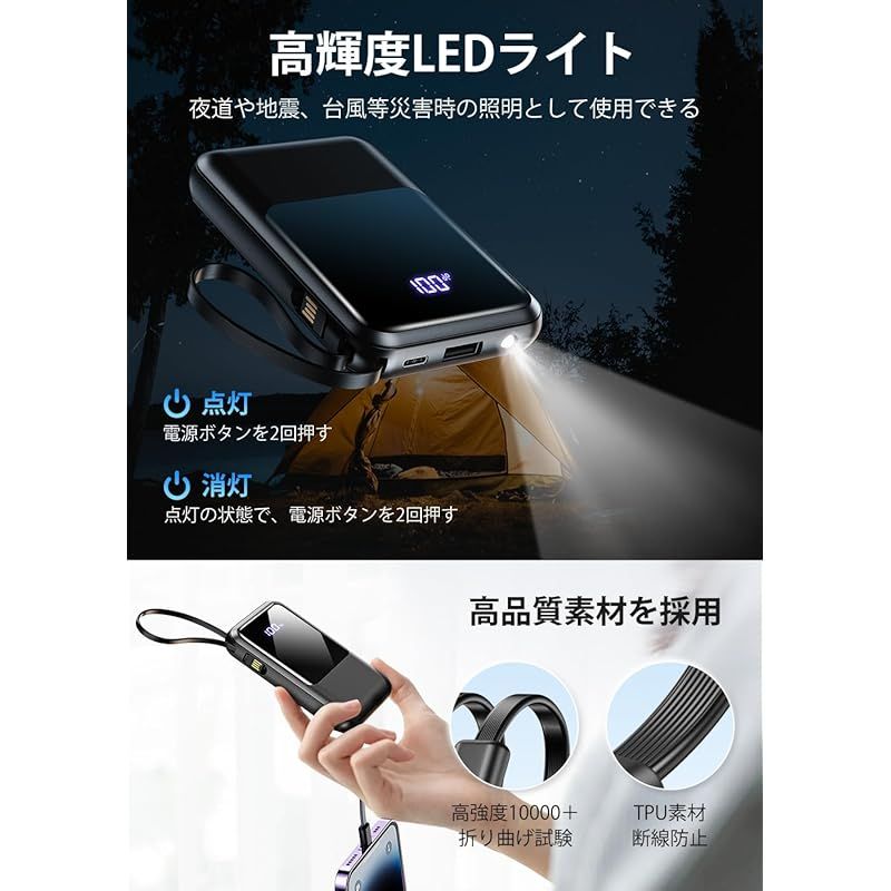 【業界の先へ!軽量・小型設計で高出力】2025最新のアップグレード・大人気のモバイルバッテリーが新登場!新たな充電体験をあなたに!スマートフォンのバッテリー容量が増えれば、その分充電時間は長くなります。そのため、HGGH製モバイルバッテリーは、iPhoneとAndroidの両方で利用できる急速充電機能を搭載しており、充電効率を95%に向上し、限られた時間の中で最大の充電効率を発揮します。次世代のUSB規格として制定された最新のコネクタ規格USB Type-Cを採用し、従来製品に比べて約4倍早くスマホを充電できるスピードを実現、わずか30分で50%まで充電可能です。パワフルかつポータブルで通勤通学の外出時や出張の際にはもちろん、停電の際や災害時に活用できる防災用途のバックアップ電源として幅広いシーンでご利用いただけます。 ????