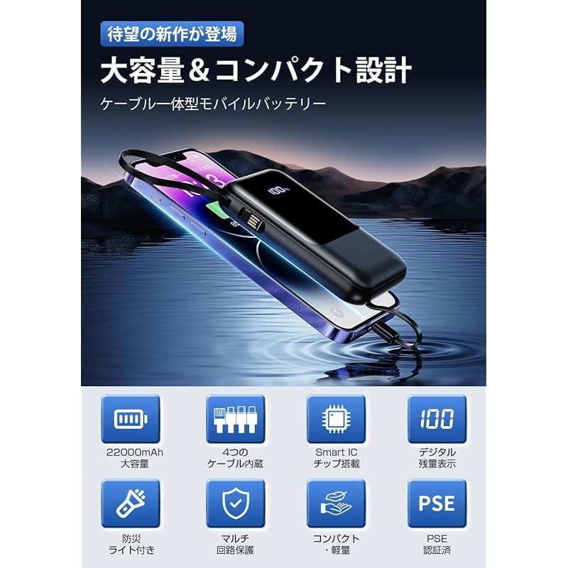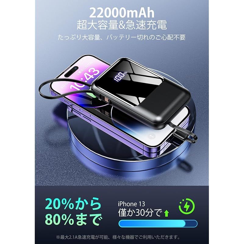 モバイルバッテリー 大容量 【22000mAh大容量・4本ケーブル一体型・急速充電】超軽量 小型 モバイルバッテリー 4台同時に充電 携帯充電器 USB-Type C入出力ポート LEDディスプレイ搭載 スマホ充電器 コンパクト 持ち運び便利 機内持込可能 0