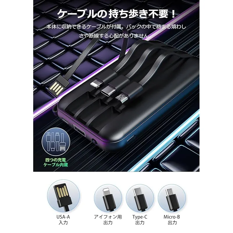 【急速充電可能なポート・4種類ケーブル内蔵】最大2.1Aで急速充電可能USB-A出力ポートを搭載することで、通常の5W出力に比べ3倍以上の速度で充電することができ、30分で約50%まで充電することができます。USB-A出力ポートと三つの出力ケーブルを内蔵されており、最大4台のデバイスの同時充電が可能、コンセントのない場所でも手軽に充電できるため、安心して出かけることが可能。??