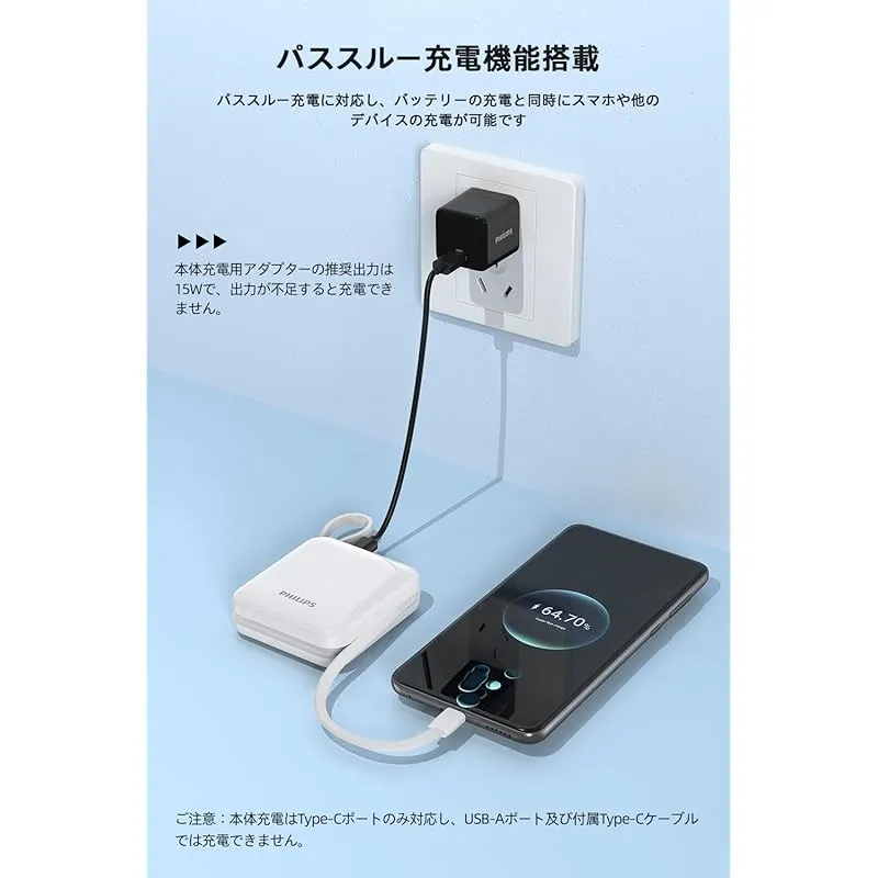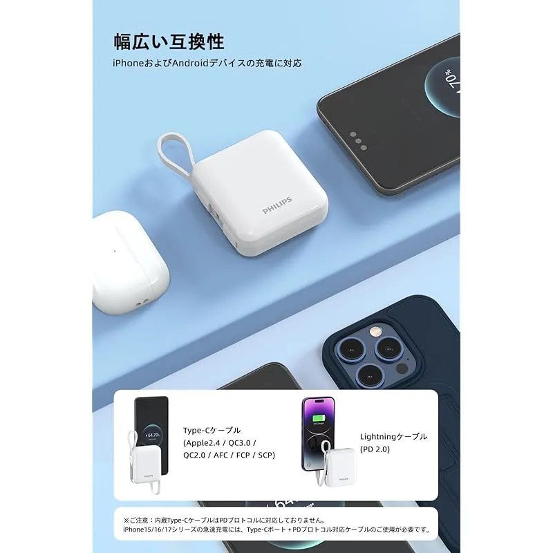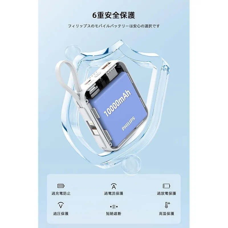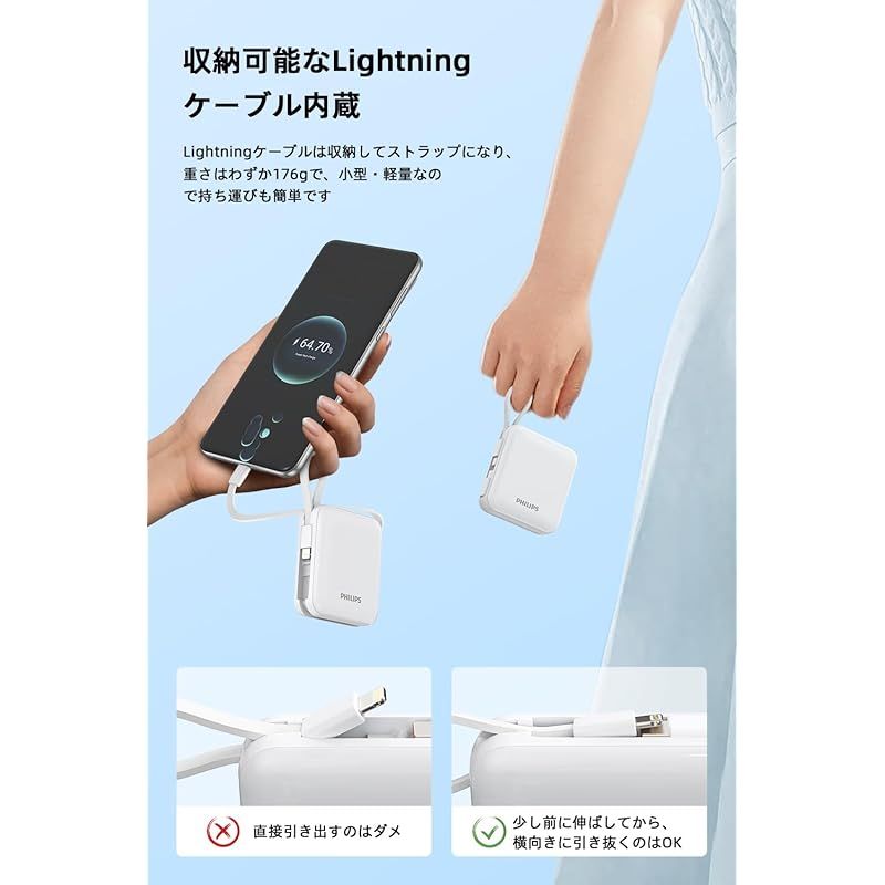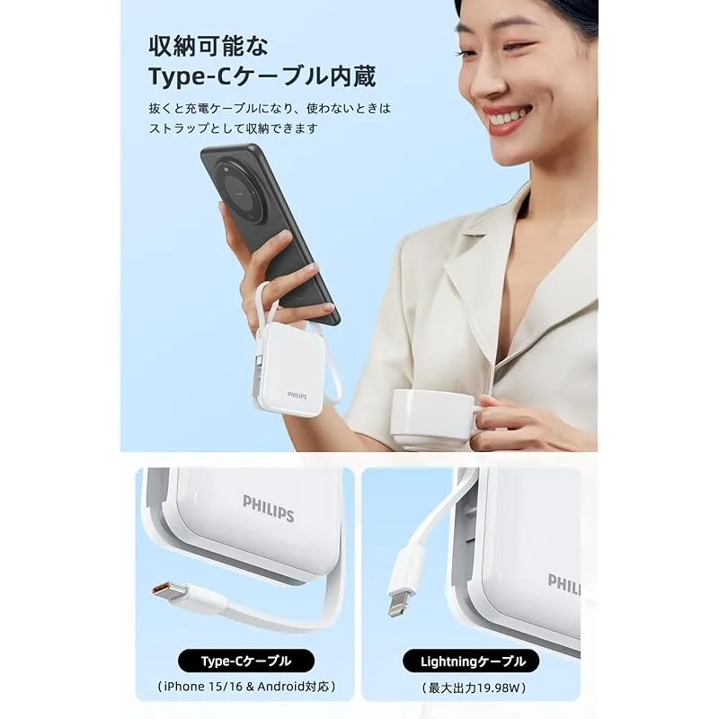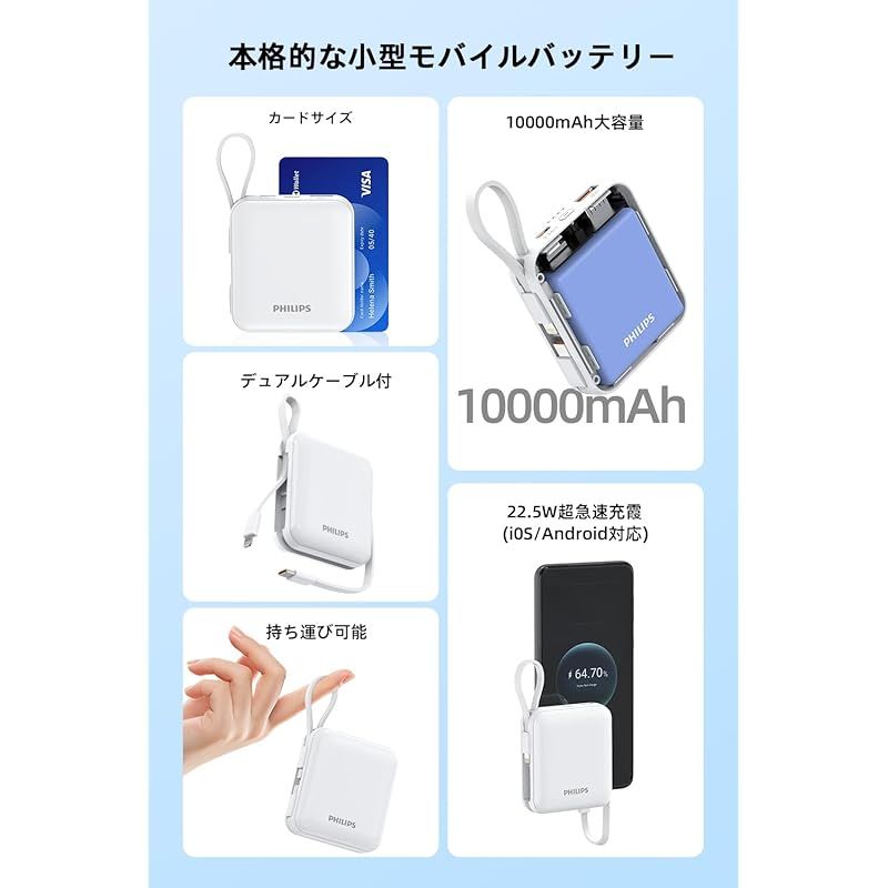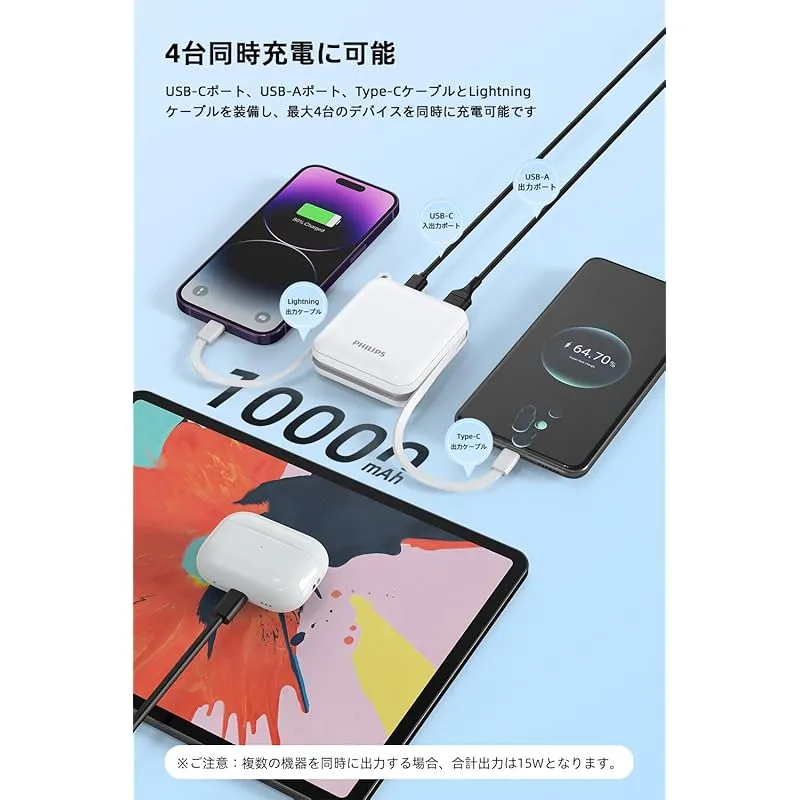 Philips (フィリップス) モバイルバッテリー 10000mAh 大容量 小型 携帯充電器 Lightning type-c ケーブル内蔵 22.5W タイプc ライトニング 4台同時充電 スマホ 持ち運び iPhone 16 / 15 Androi 0