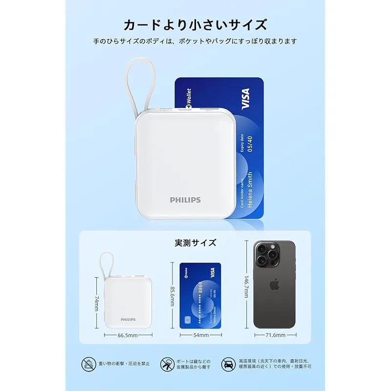 【カードサイズで携帯便利】 PHILIPS 超小型モバイルバッテリー新登場!6.65cmx2.55cmx7.4cmのミニボディ、手のひらサイズでポケットやカバンにもすっぽり収まります。 重さはわずか176gで、手に持っても負担になりません。歩きながら充電する必要がある方には、間違いなくおすすめのアイテムです。