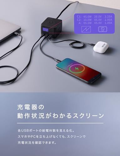D★CIO 卓上 電源タップ USB付 Polaris CUBE DESK PD 65W [CIO独自技術 Nova Intelligence ] 液晶付 コード長 1.5m USB-C×2 USB-A×1 AC×3 合計6口 Type-C Type-A AC