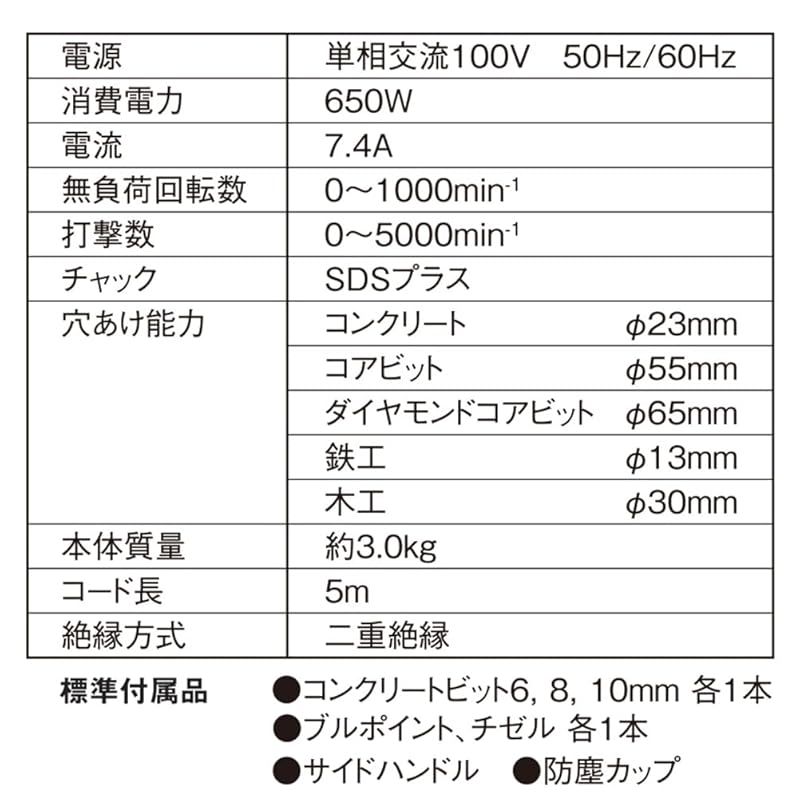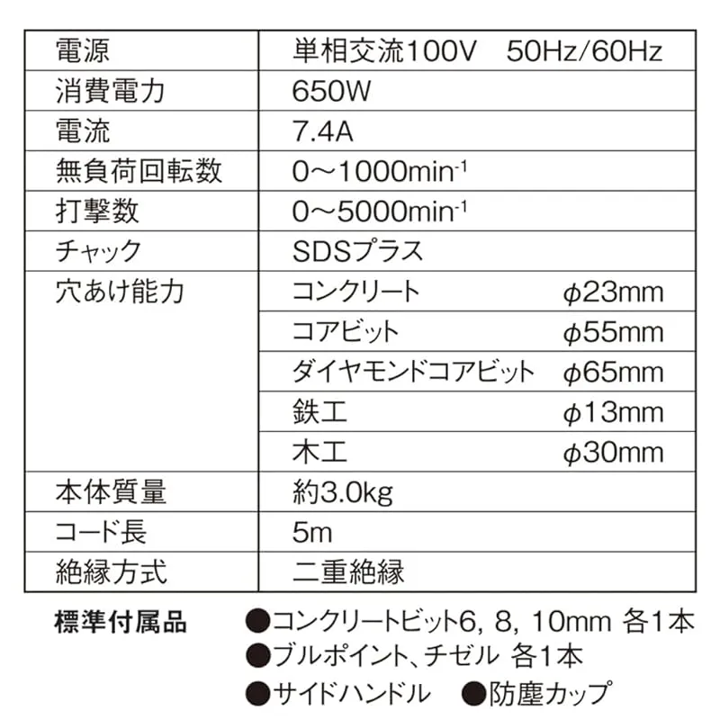 【商品概要】 電源:単相交流100V・50/60Hz、消費電力:650W、電流:7.4A、仕様:PSEマーク認証 無負荷回転数:0~1000min-1、打撃数:0~5000min-1、チャック:SDSプラス 本体サイズ:約370幅×210高×100奥行mm、電源コード長:約5m、本体質量:約3.0kg、本体材質:樹脂 穴あけ能力:コンクリート23mm・コアビット55mm・ダイヤモンドコアビット65mm・鉄工13mm・木工30mm 付属品:コンクリートビット6・8・10mm各1本・ブルポイント・チゼル各1本・サイドハンドル