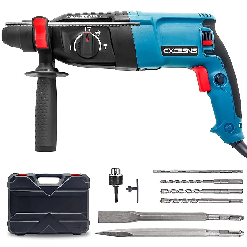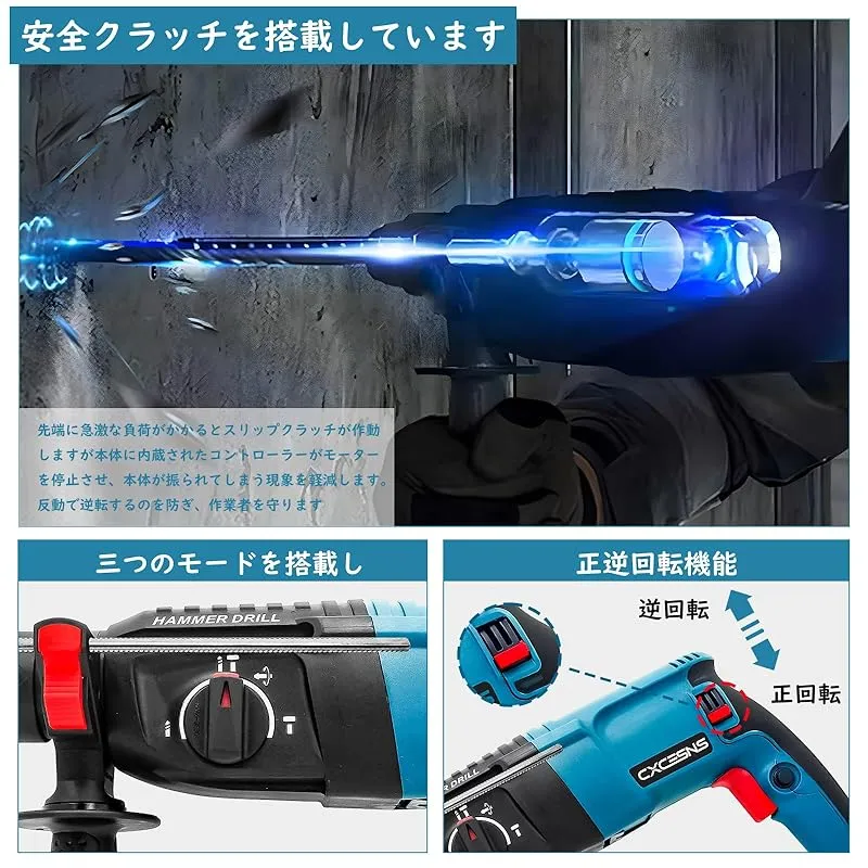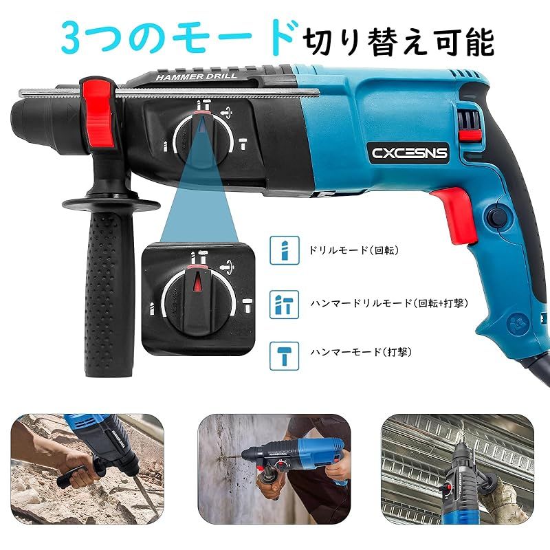 CXCESNS ハンマードリル 電動ハンマドリル 強力 110V コード式 低振動機構 無段階変速 3モード コンクリート26mm/鉄工13mm/木工30mm 電気ドリル 電気ハンマ SDSプラスビット5本 ドリルチャック1個 収納バッグ付き 日本語取扱説明書