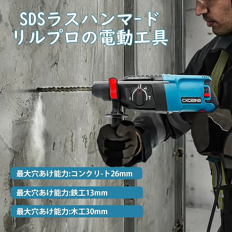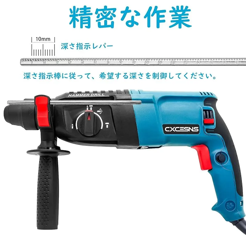 【商品詳細】 ブランド:CXCESNS 商品種別:ハンマードリル 商品名:CXCESNS ハンマードリル 電動ハンマドリル 強力 110V コード式 低振動機構 無段階変速 3モード コンクリート26mm/鉄工13mm/木工30mm 電気ドリル 電気ハンマ SDSプラスビット5本 ドリルチャック1個 収納バッグ付き 日本語取扱説明書 製造元:CXCESNS 色:ブルー