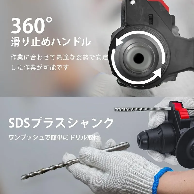 【知らせ】1.同梱でされた先端工具をご利用の場合、ドリルチャックに差し込む必要なし、直接商品本体に取り付けてください。ドリルチャックに差し込んでから使える先端工具はお好みで別購入してください。2.私たちのハンマードリルは、"回転モード"だけで逆回転をサポートし。