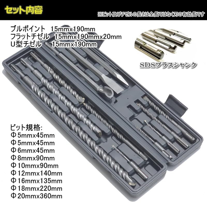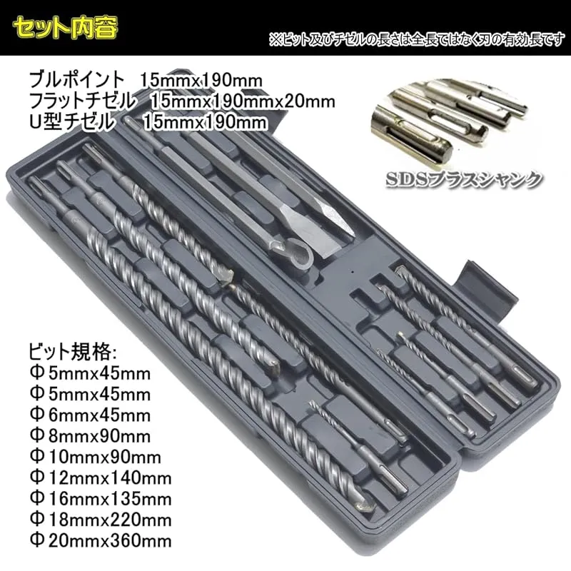 【付属品】ブルポイント 15mmx190mm 、 フラットチゼル 15mmx190mmx20mm 、 U型チゼル 15mmx190mm、 ビット規格: Φ5mmx45mm、 Φ5mmx45mm、 Φ6mmx45mm、 Φ8mmx90mm、 Φ10mmx90mm、 Φ12mmx140mm、 Φ16mmx135mm、 Φ18mmx220mm、 Φ20mmx360mm、 ※ビット及びチゼルの長さは全長ではなく刃の有効長です