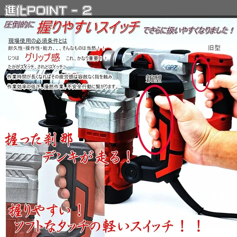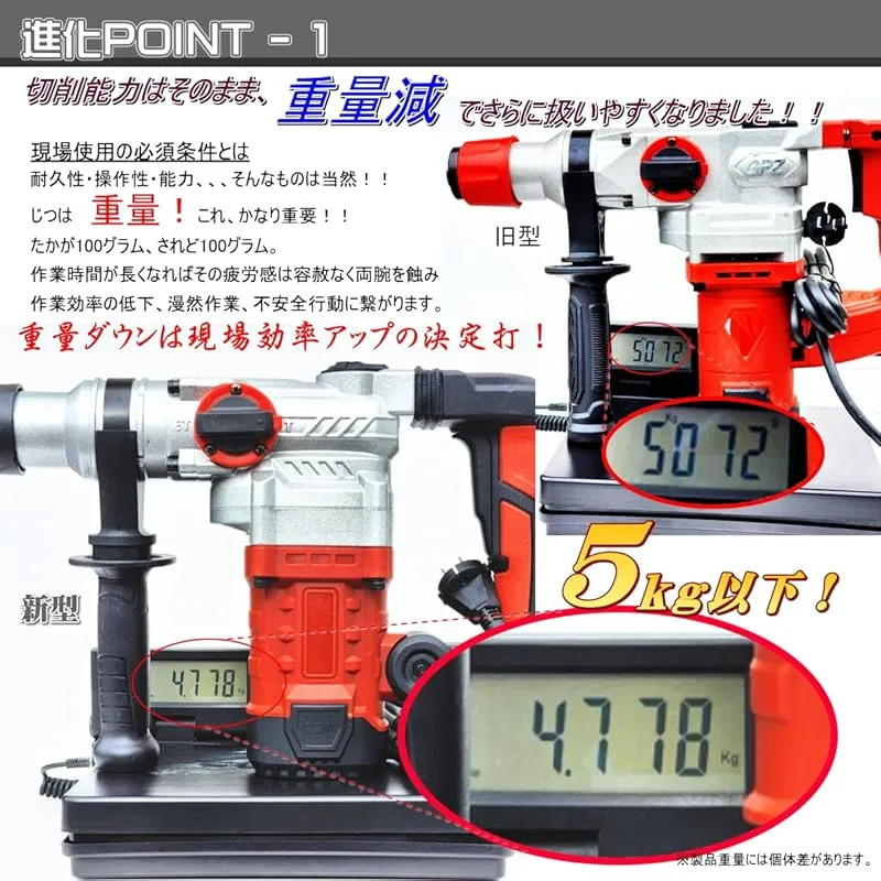 【商品説明】 重量約5kgの軽量で取り回しも良く、クラス最大級の強力なはつり・切削能力を発揮します! 重機械の届かない物を取り壊す際など 建設現場でのコンクリート構造物の破壊、アンカー削孔などで大活躍! 付属品につきましては画像の物がすべてです。 電気用品安全法(PSEマーク)取得済み商品となります。