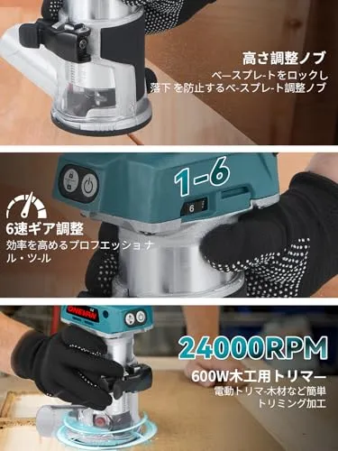 【6段変速&最大20mm深度調整用途別に最適コントロール】6段階の回転数調整(10000~30000RPM)により、柔らかい木材から硬木まで素材に合わせた加工が可能。切削深さは最大20mmまで微調整でき、溝加工・端面処理・円形加工など幅広い木工用途に対応する充電式ルーターです。