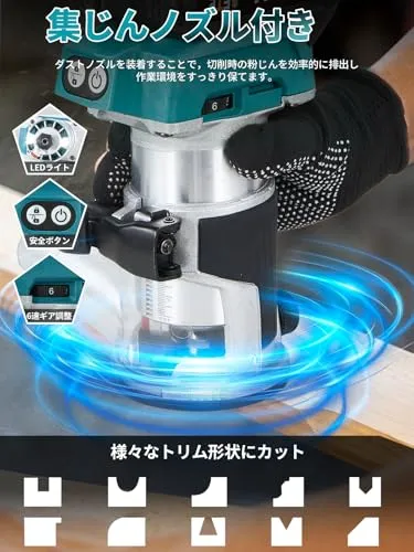 ◆トリマー 電動工具 ルーター 木工用 充電式 6段変速 10000~30000RPM 集塵アダプター付き 深さ20mm調整 6.35mmビット対応 マキタ18V互換 電動トリマー DIY溝切り・面取り(本体だけ)