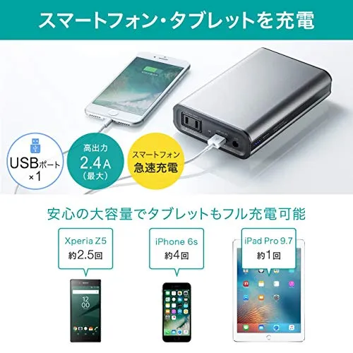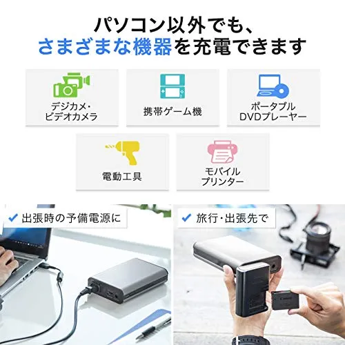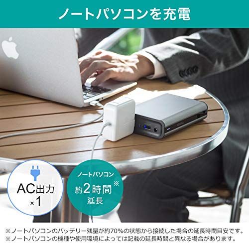 ノートパソコンでは約2時間稼働時間を延長することができます。(※ノートPCのバッテリー残量が約70%の状態から接続した場合の延長時間目安)USB出力ポートは最大2.4Aまで出力可能で、iPadなどのタブレットPCを充電することができます。