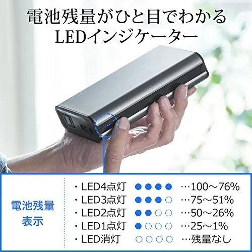 本体側面に残量表示LEDを搭載しており、電源ボタンを押すことでバッテリー残量を確認できます。
