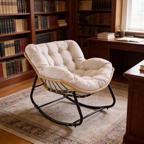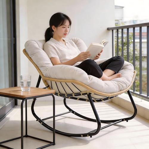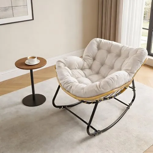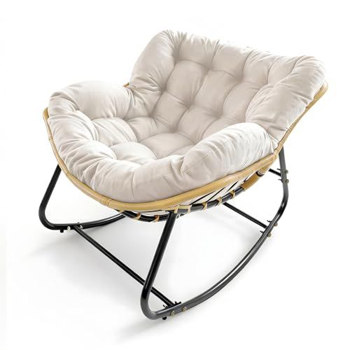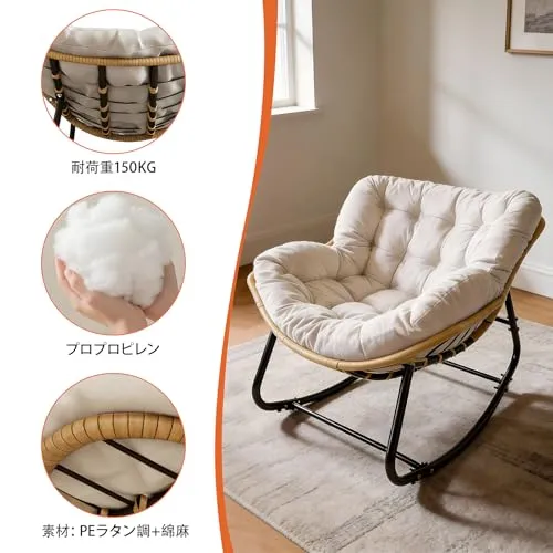 ◆HopeFamily ロッキングチェア リラックスチェア 一人掛け 綿麻製 大型 厚手クッション 耐荷重150KG 耐摩耗 屋外 屋内 北欧風 おしゃれ 揺れる椅子 読書 昼寝 リビング 寝室 バルコニー 組み立て簡単 (オフホワイト)