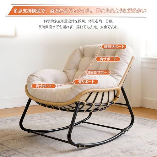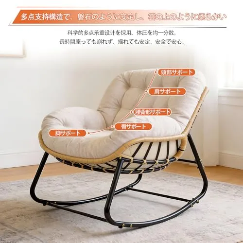 【綿麻製・通気性抜群】天然の綿麻素材を採用し、通気性に優れ蒸れにくく快適です。耐摩耗性も高く、長期間使用しても生地が傷みにくい仕様。オールシーズン心地よくご使用いただけます。前傾30、後傾30の角度で揺れるロッキングチェアは、頭・肩・腰・臀部をしっかり支え、圧力を分散します。