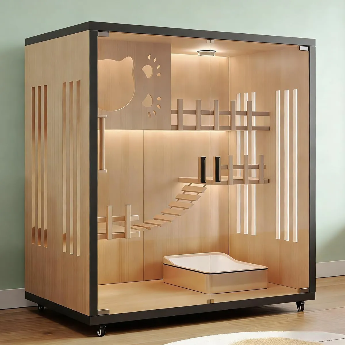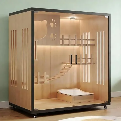 【天然木強化ガラスで安心設計】本体にはあたたかい木材を使用し、細部までなめらかに仕上げた柔らかな質感が特徴です。扉には透明度の高いガラスを採用し、割れにくく安全性にも配慮。木のぬくもりとガラスのクリアな美しさが調和したデザインで、見た目にも心地よく、猫ちゃんの様子をいつでもはっきり確認できます。丈夫で長く使える安心の構造です。