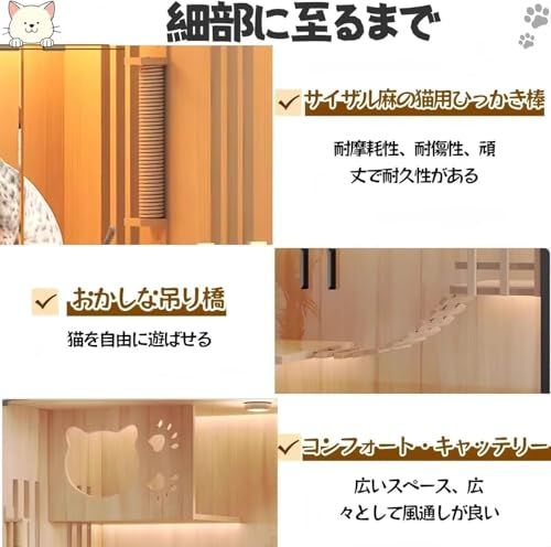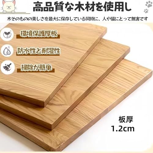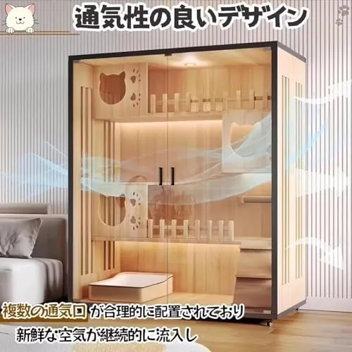 【猫ちゃんが快適に過ごせる】ケージ内が通気性が良くて、ムレにくく、長時間でも快適に過ごせます。また、ゆとりのあるスペースで、上下動やちょっとした移動がしやすいです。木材の滑らかな質感と明るい空間が、猫に落ち着きを与え、リラックスした環境を提供します。