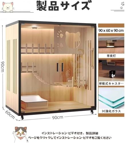 猫 ケージ 大型 木製 キャットケージ キャスター付き 90*61.6*90cm 多層構造 猫ハウス キャットヴィラ 透明ガラス扉 脱走防止 通気換気 多頭飼い対応 組立簡単 猫カフェ ペット病院 家庭用 日本語説明書付き(ナチュラル)