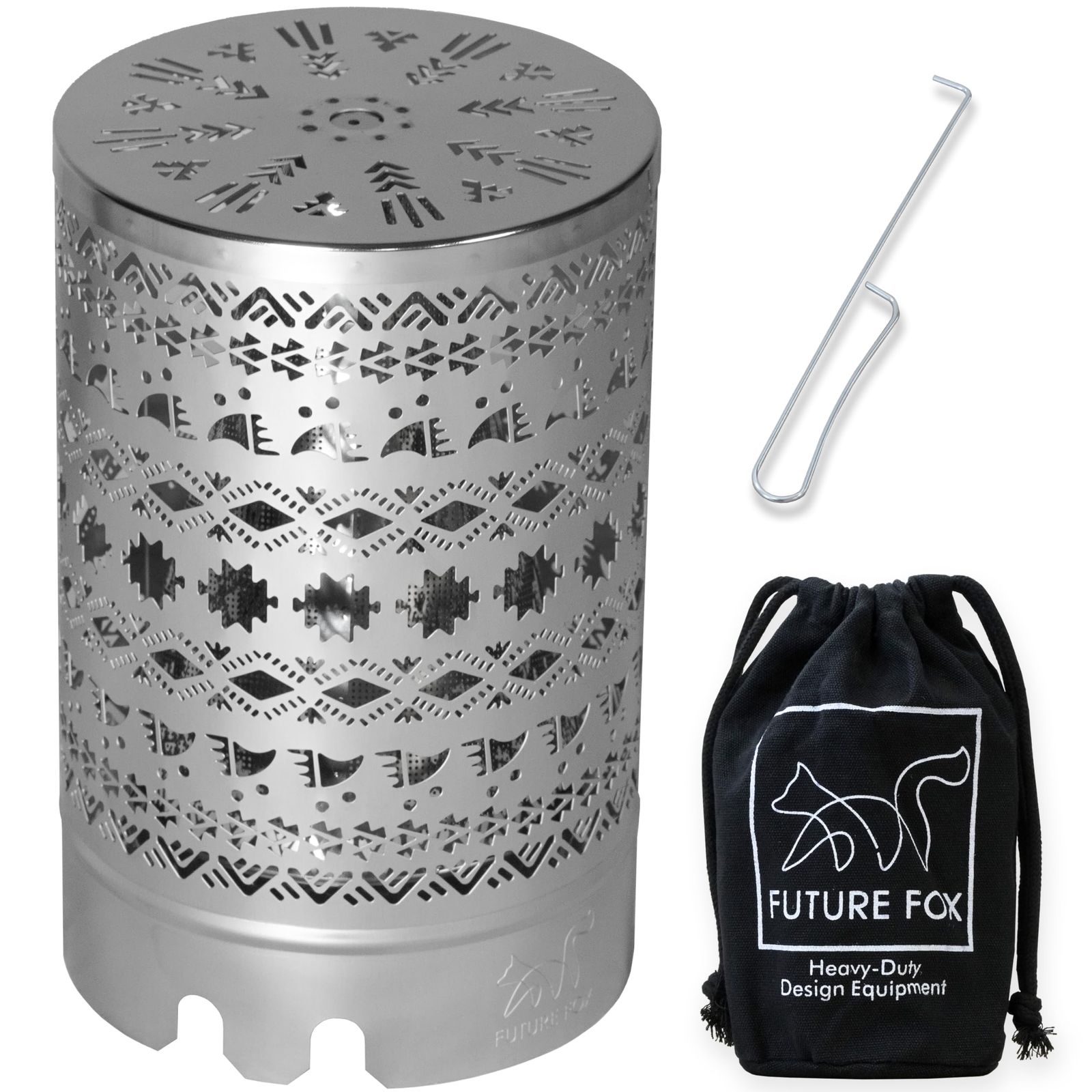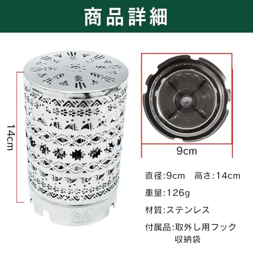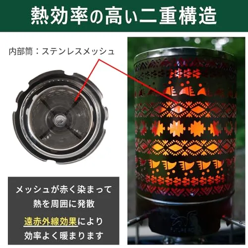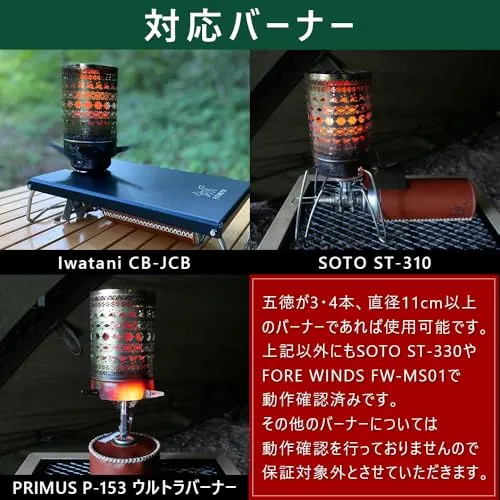 【前モデルとの変更点】1.3本五徳のバーナーに対応:既存のモデルと一番の変更点は3本五徳のバーナーに対応している点です。既存のモデルは4本五徳のバーナーのみにしか対応しておりませんでしたが、新モデルは3本五徳にも4本五徳にも対応できるよう改良しました。これにより、ほぼ全てのシングルバーナーでお使いいただけるようになりました。 2.全ての面をナバホ柄に:本製品の最大の特徴でもありますが、今回は全面をナバホ柄にしました。二重構造となり、外側の面を透し彫りにしています。暖をとるだけでなく、暖をとりながら内部が赤く染まっている様子をナバホ柄を通して鑑賞することができます。 3.上面もナバホ柄で透し彫りに:暖房器具としての効果を最大限発揮させるために上面にも透し彫りを入れました。既存のヒーターアタッチメントは上方向への熱の上昇気流がありませんでしたが、今回は上方向にも熱が拡散されるため、より暖房器具としての効果が発揮されます。 4.上面を平らにしたことでクッカーが安定:上面を平らにしたことで、ヒーターアタッチメントの上にクッカーをのせた場合でも安定します。 また、上面の透し彫りからも熱が放出されるので簡単にお湯を沸かすことが可能となりました。